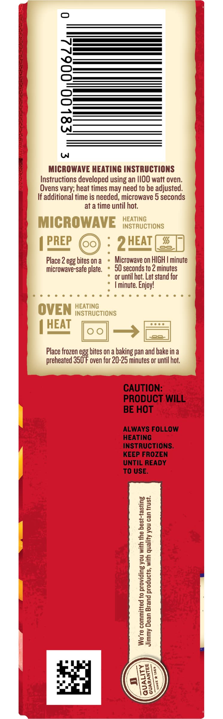 Directions for use: Directions: Fully cooked. Always follow heating instructions. Microwave Heating Instructions: Instructions developed using an 1100 watt oven. Ovens vary; heat times may need to be adjusted. If additional time is needed, microwave 5 seconds at a time until hot. Heating Instructions: 1. Prep: Place 2 egg bites on a microwave-safe plate. 2. Heat: Microwave on high 1 minute 50 seconds to 2 minutes or until hot. Let stand for 1 minutes. Enjoy! Oven Heating Instructions: 1. Heat: Place frozen egg bites on a baking pan and bake in a preheated 350 degrees F oven for 20-25 minutes or until hot. Caution: Product will be hot. Always follow heating instructions. Keep frozen until ready to use. Keep frozen. Open. Storage recommendation: Keep frozen.