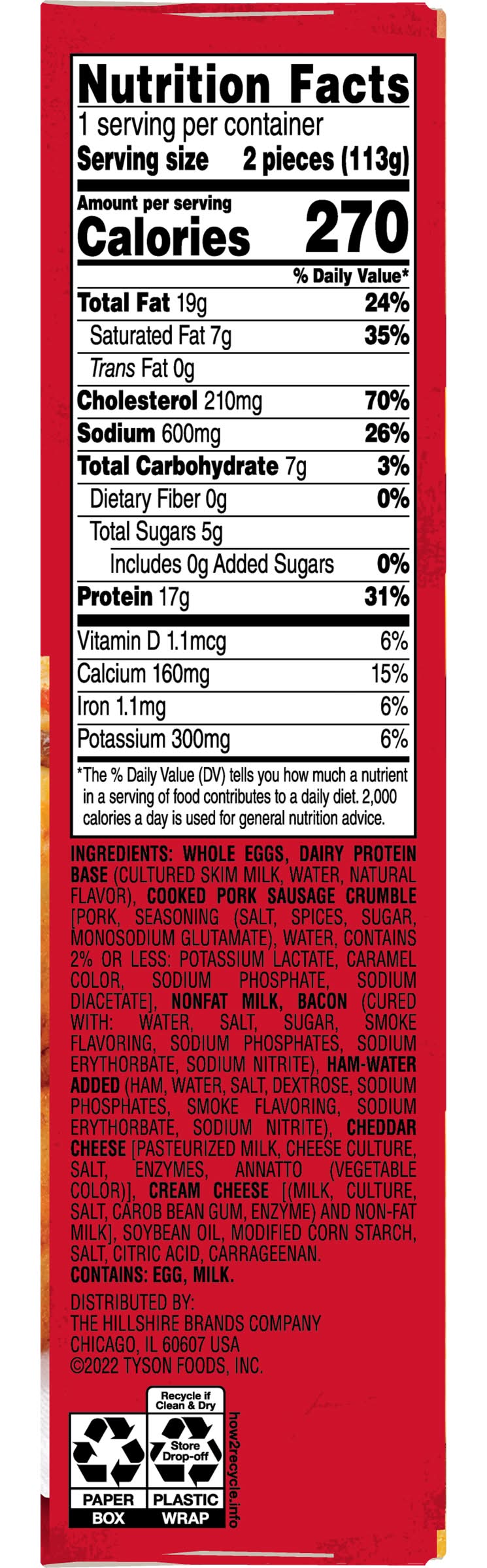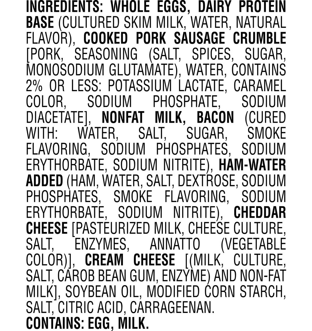 Ingredients: Whole Eggs Dairy Protein Base (Cultured Skim Milk, Water, Natural Flavor) Cooked Pork Sausage Crumble [Pork, Seasoning (Salt, Spices, Sugar, Monosodium Glutamate), Water Contains 2% or Less: Potassium Lactate Caramel Color Sodium Phosphate Sodium Diacetate], Nonfat Milk Bacon (Cured with: Water, Salt, Sugar, Smoke Flavoring, Sodium Phosphates, Sodium Erythorbate, Sodium Nitrite, Ham-Water Added (Ham, Water, Salt, Dextrose, Sodium Phosphates, Smoke Flavoring, Sodium Erythorbate, Sodium Nitrite) Cheddar Cheese [Pasteurized Milk, Cheese Culture, Salt, Enzymes, Annatto (Vegetable Color)], Cream Cheese [(Milk, Culture, Salt, Carob Bean Gum, Enzyme) and Non-Fat Milk] Soybean Oil Modified Corn Starch Salt Citric Acid Carrageenan. Contains: Eggs, Soybean, Milk, Corn