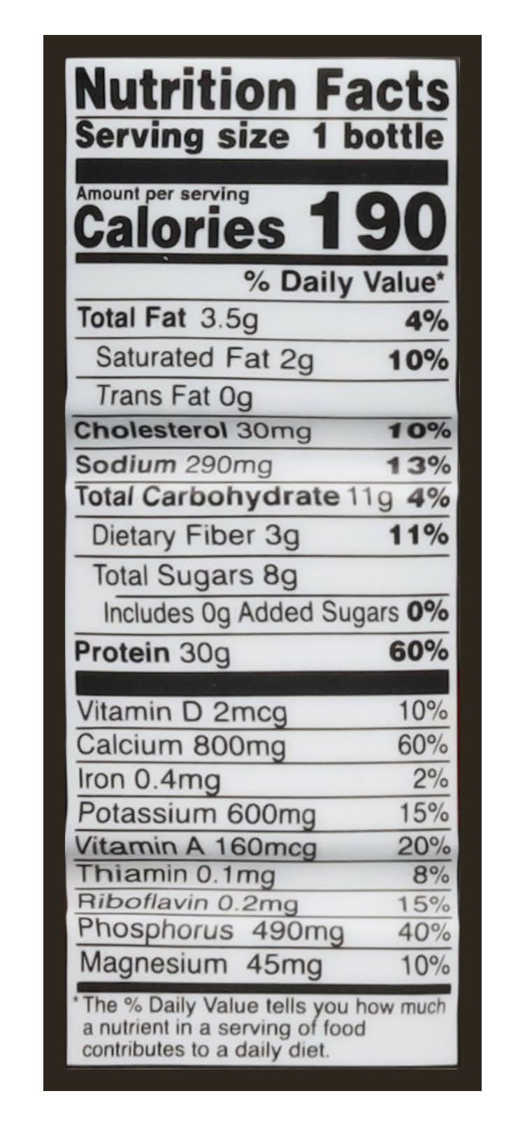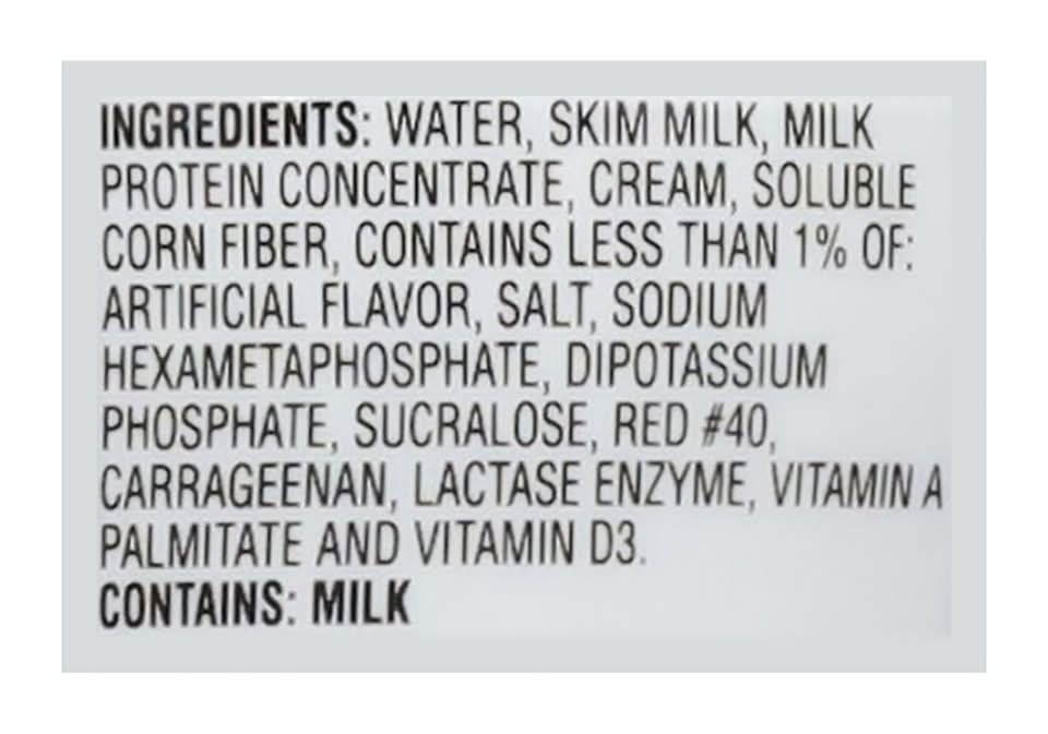 Ingredients: Water, Skim Milk, Milk Protein Concentrate, Cream, Soluble Corn Fiber, Contains Less than 1% of: Artificial Flavor, Salt, Sodium Hexametaphosphate, Dipotassium Phosphate, Sucralose, Red #40, Carrageenan, Lactase Enzyme, Vitamin A Palmitate and Vitamin D3 Contains: Milk Additives: Artificial Flavors