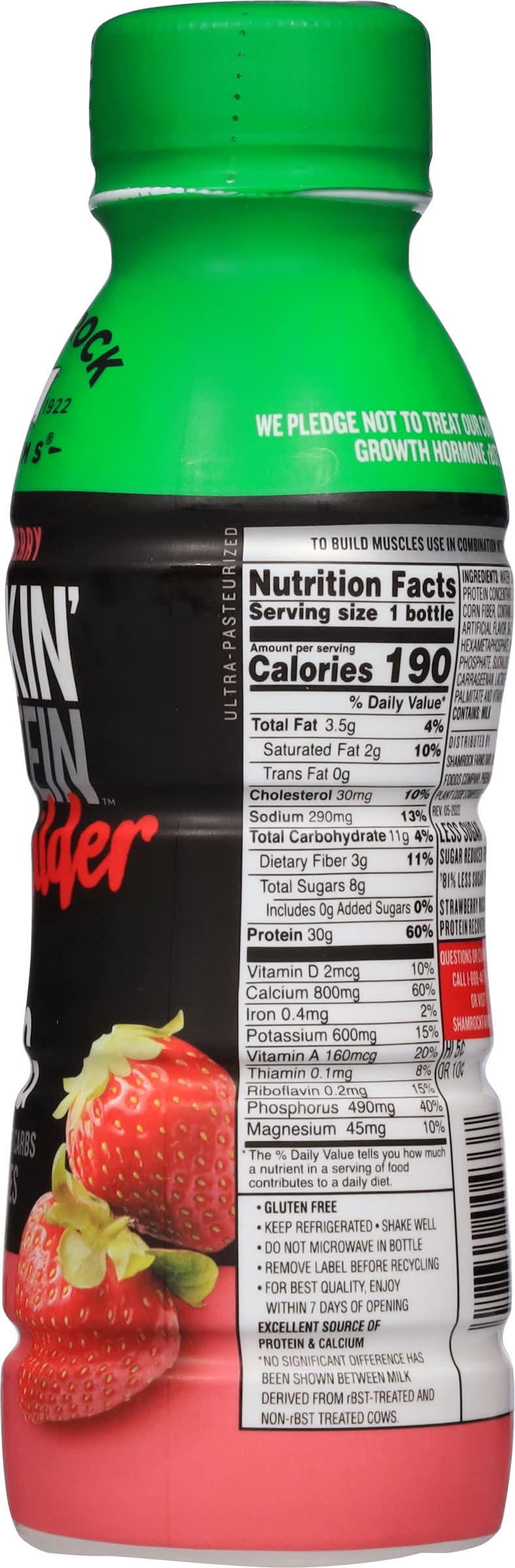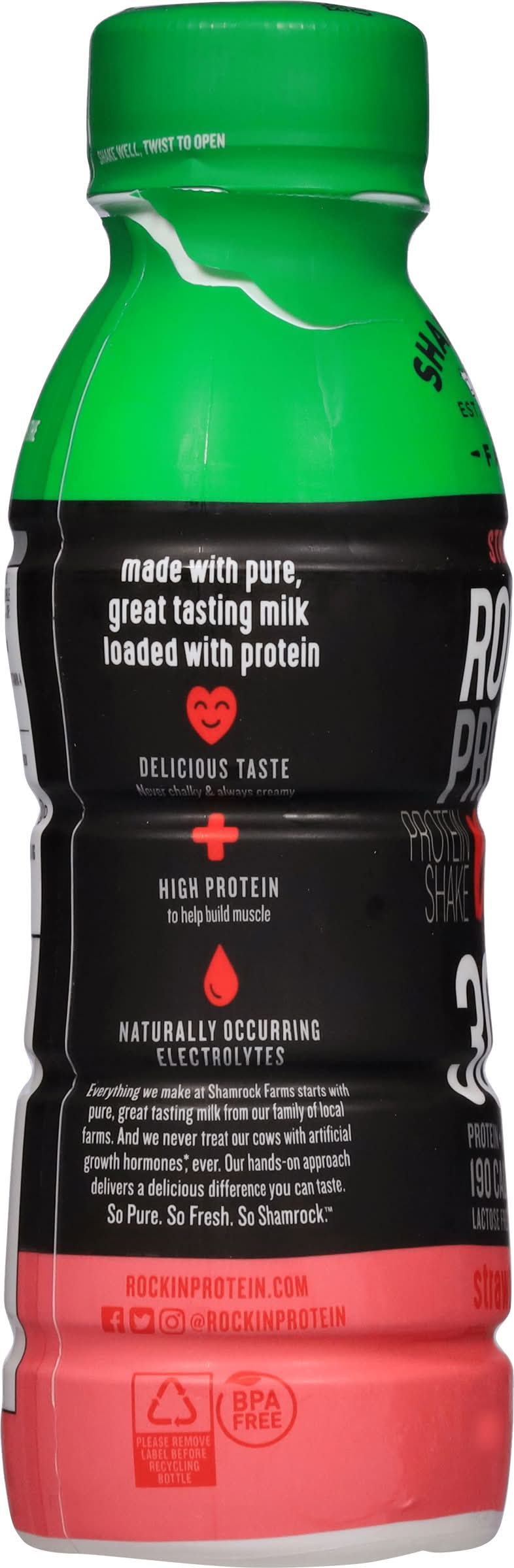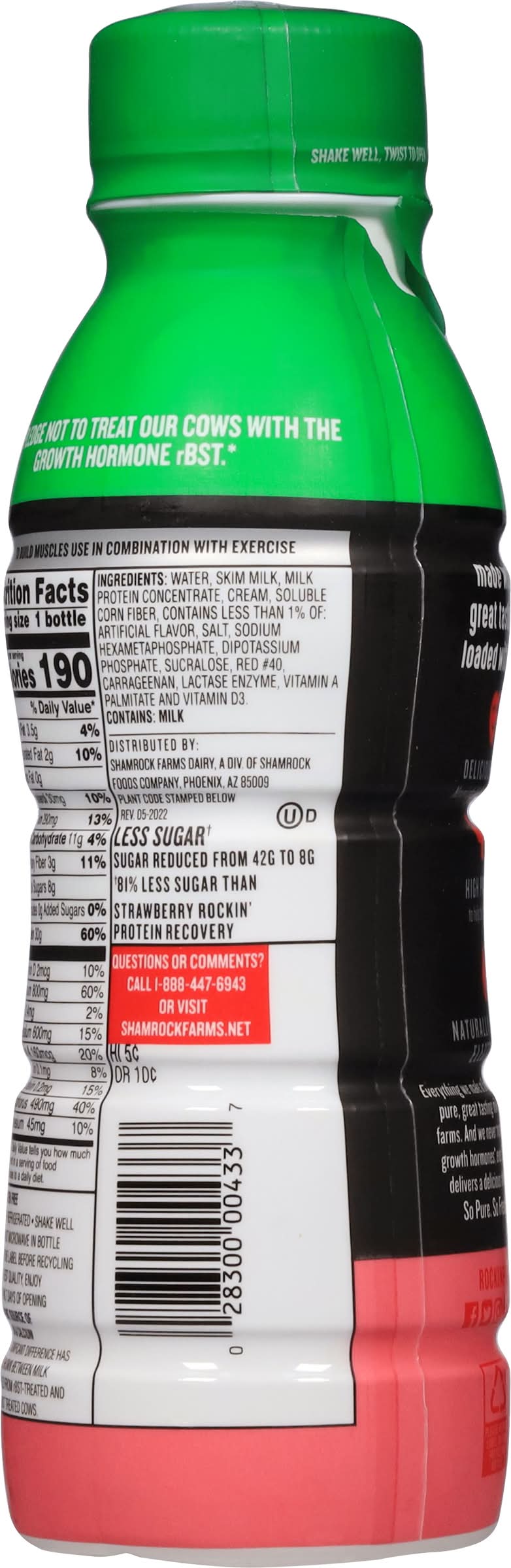 Less sugar† Sugar reduced from 42g to 8g †81% less sugar than Strawberry Rockin' Protein Recovery. • Flavor: Strawberry • Shamrock Foods Company, Phoenix, AZ, 85009 • Packaging: Reusable
