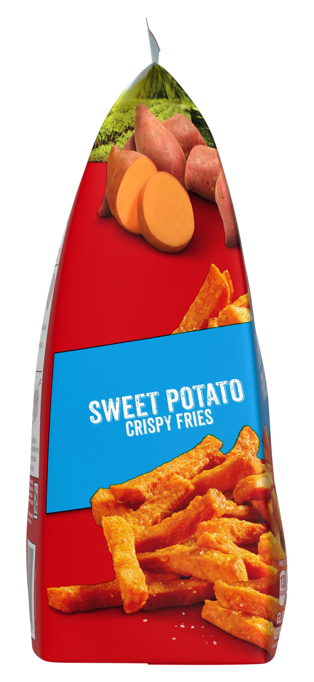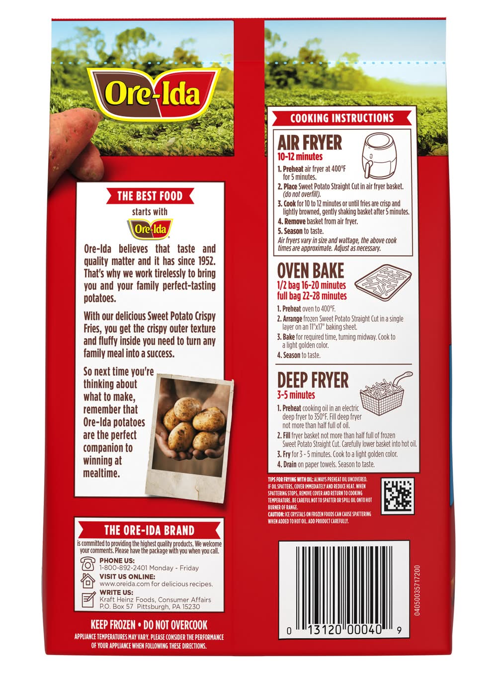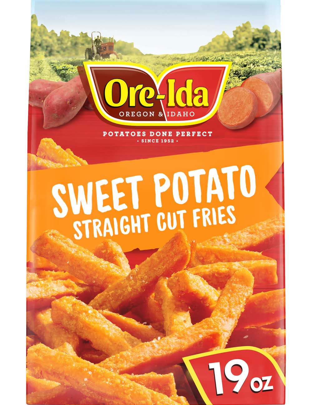 Ore-Ida Sweet Potato Fries make it easy to enjoy frozen fries at home without the work. Our crispy, golden delights are made from 100% real, freshly peeled sweet potatoes. Each bag of sweet potato fries are gluten free, and have a uniquely satisfying crispness and great natural flavor. Pop them in the oven on a baking sheet, and cook them according to the package instructions for perfectly crunchy fries every time. The straight cut french fryshape adds to the crispiness, while making them perfect for dipping too. Serve these baked sweet potato fries along with burgers, hot dogs and other favorites for a family favorite side dish everyone enjoys. Each bag of frozen sweet potato fries come sealed in a 19 ounce bag for easy storage in your freezer.