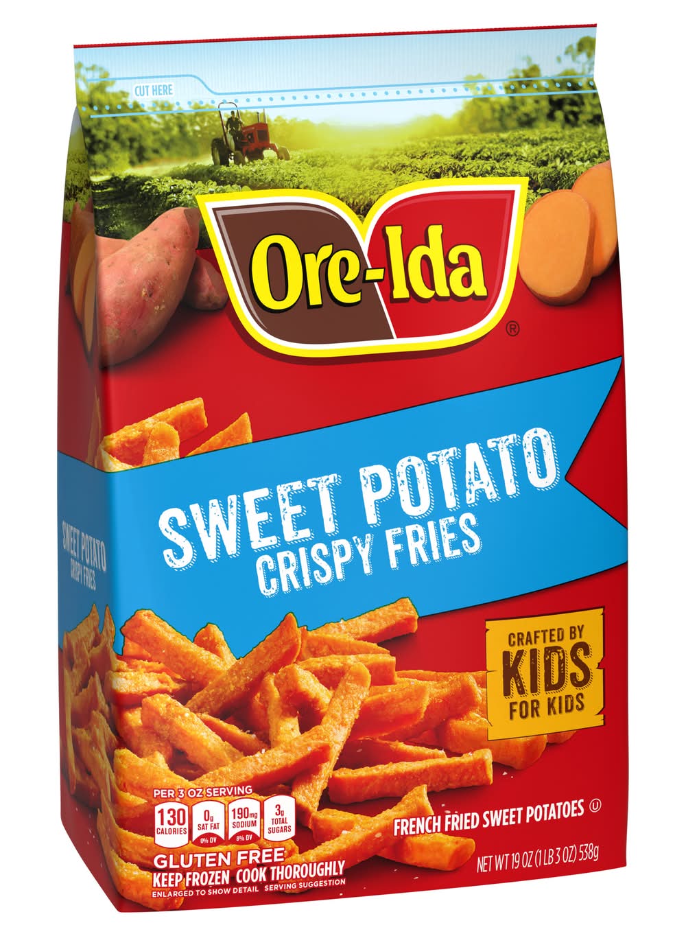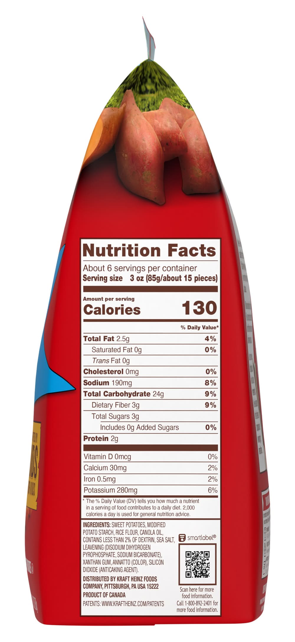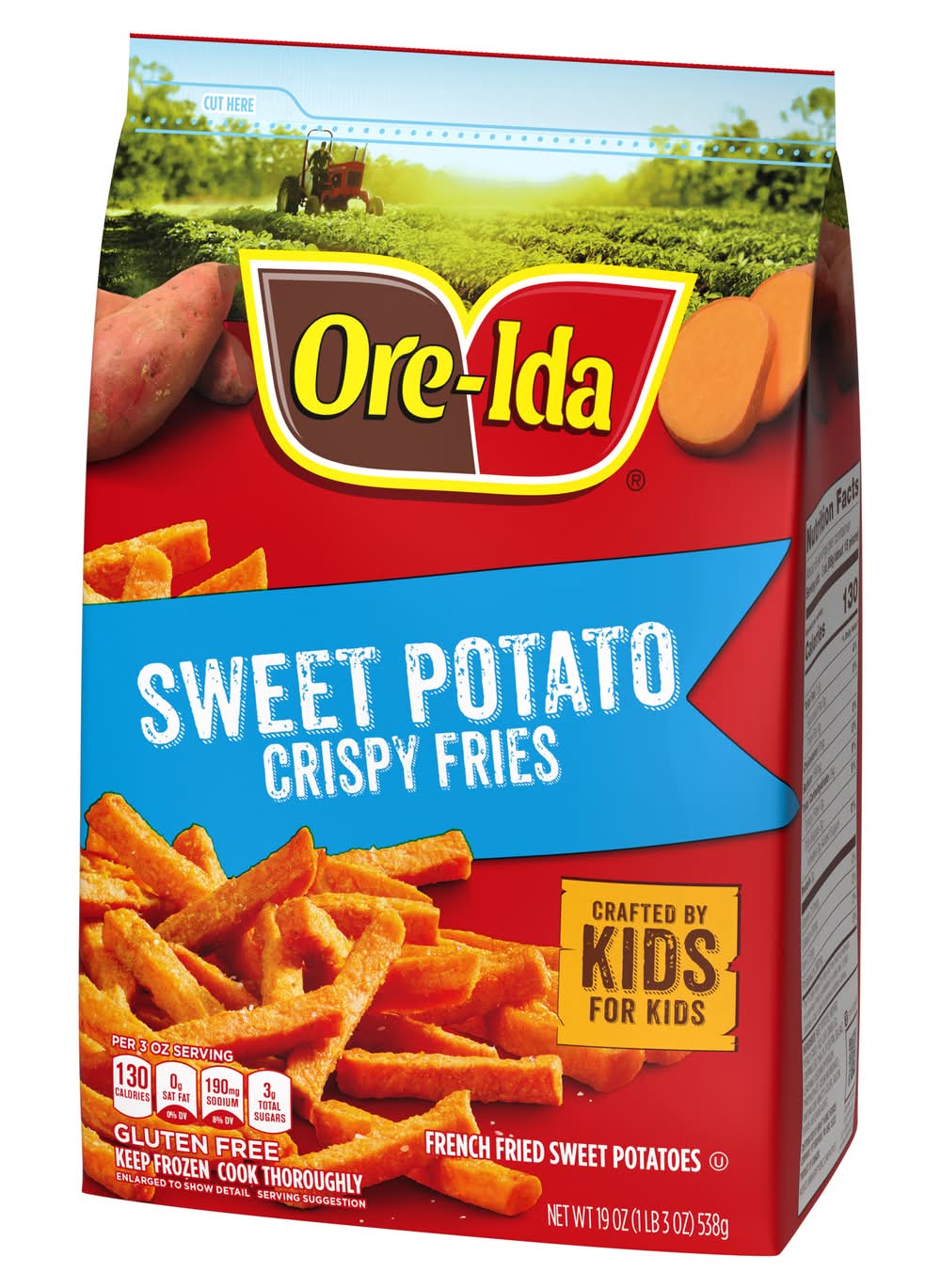Ore-Ida Sweet Potato Fries make it easy to enjoy frozen fries at home without the work. Our crispy, golden delights are made from 100% real, freshly peeled sweet potatoes. Each bag of sweet potato fries are gluten free, and have a uniquely satisfying crispness and great natural flavor. Pop them in the oven on a baking sheet, and cook them according to the package instructions for perfectly crunchy fries every time. The straight cut french fryshape adds to the crispiness, while making them perfect for dipping too. Serve these baked sweet potato fries along with burgers, hot dogs and other favorites for a family favorite side dish everyone enjoys. Each bag of frozen sweet potato fries come sealed in a 19 ounce bag for easy storage in your freezer.