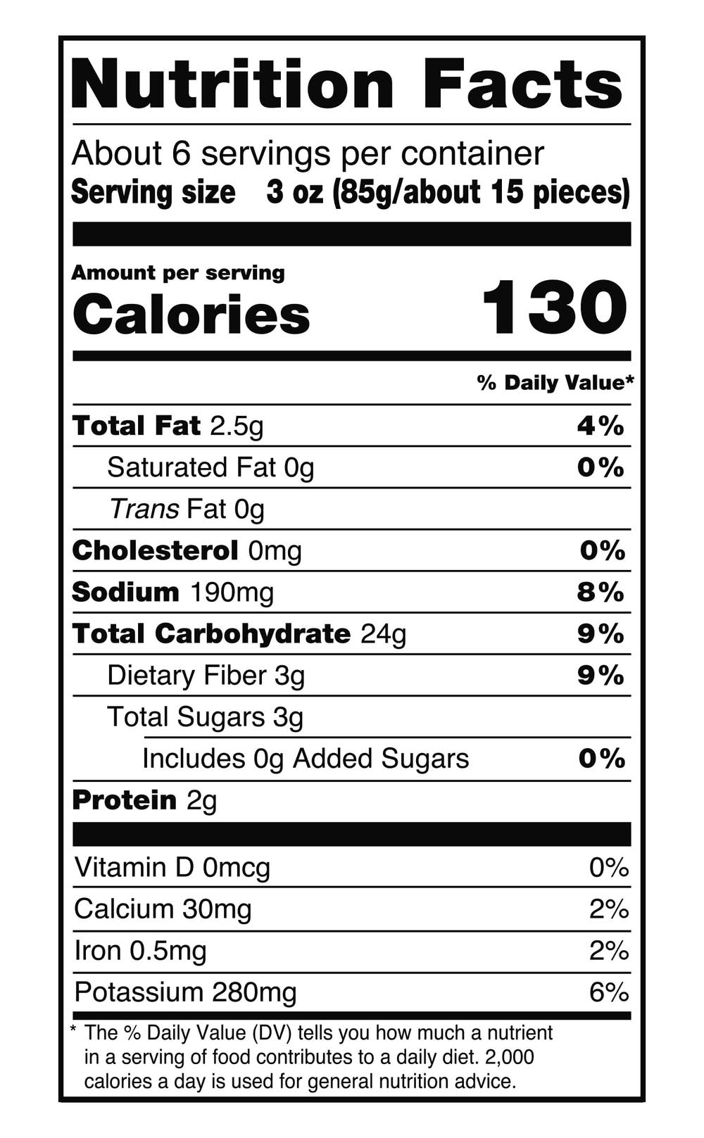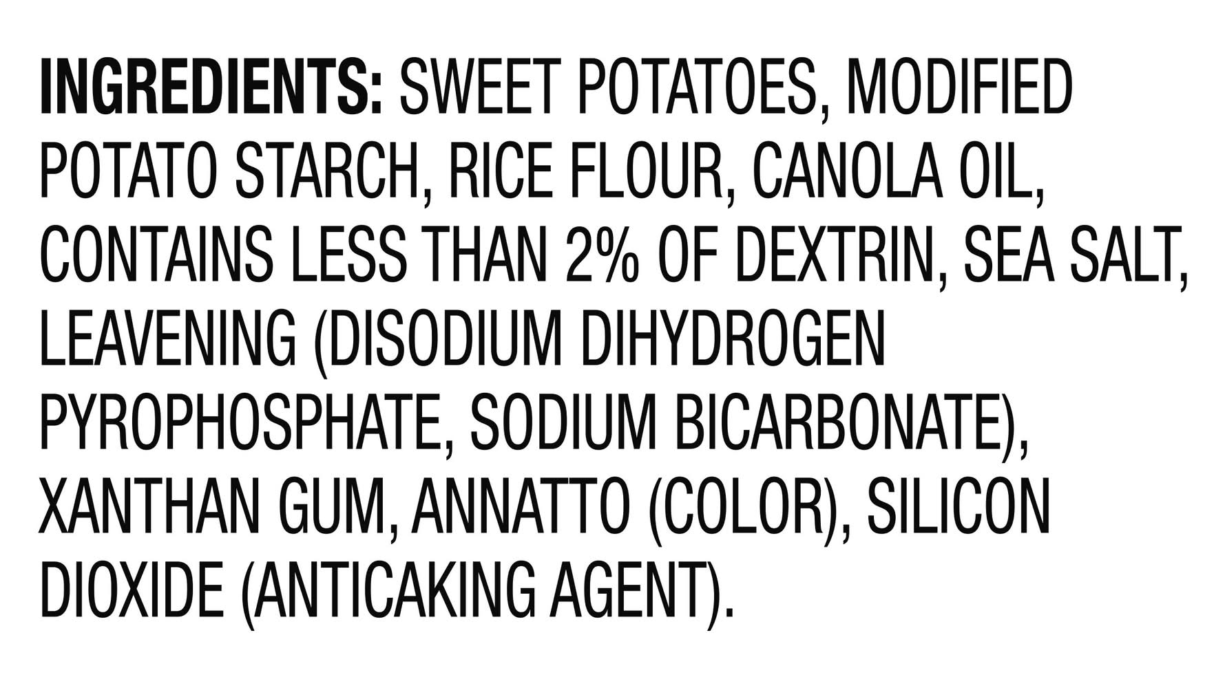 Ingredients: SWEET POTATOES, MODIFIED POTATO STARCH, RICE FLOUR, CANOLA OIL, DEXTRIN, SEA SALT, LEAVENING (DISODIUM DIHYDROGEN PYROPHOSPHATE, SODIUM BICARBONATE), XANTHAN GUM, ANNATTO (COLOR), SILICON DIOXIDE (ANTI-CAKING AGENT), .