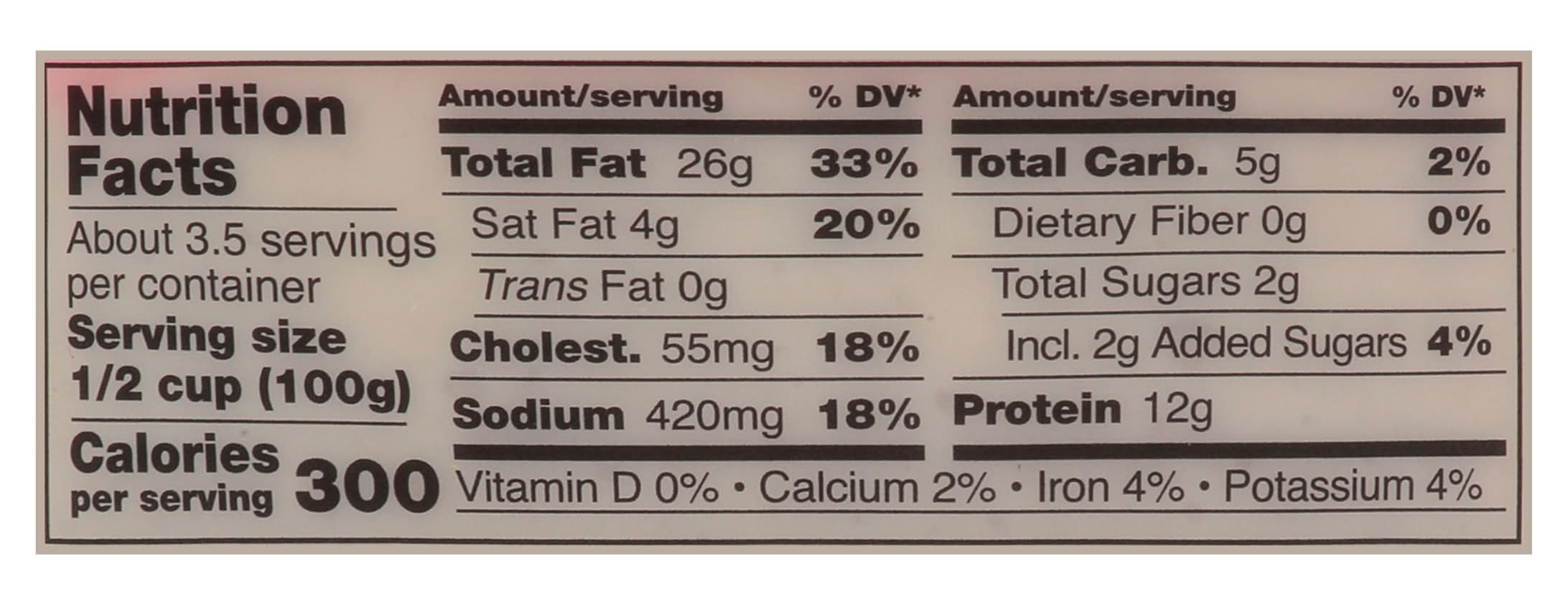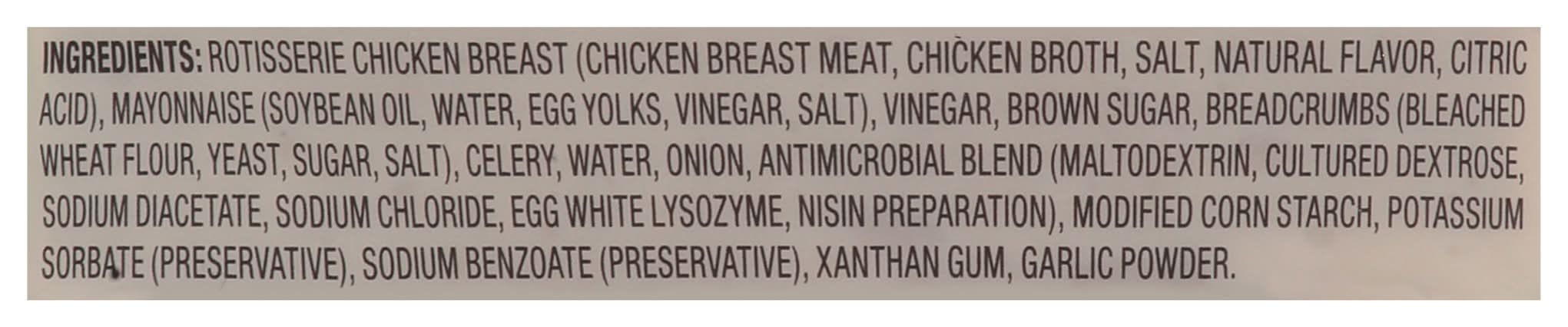 Ingredients: Rotisserie Chicken Breast (Chicken Breast Meat, Chicken Broth, Salt, Natural Flavor, Citric Acid), Mayonnaise (Soybean Oil, Water, Egg Yolks, Vinegar, Salt), Vinegar, Brown Sugar, Breadcrumbs (Bleached Wheat Flour, Yeast, Sugar, Salt), Celery, Water, Onion, Antimicrobial Blend (Maltodextrin, Cultured Dextrose, Sodium Diacetate, Sodium Chloride, Egg White Lysozyme, Nisin Preparation), Modified Corn Starch, Potassium Sorbate (Preservative), Sodium Benzoate (Preservative), Xanthan Gum, Garlic Powder Contains: Soybeans, Eggs, Wheat