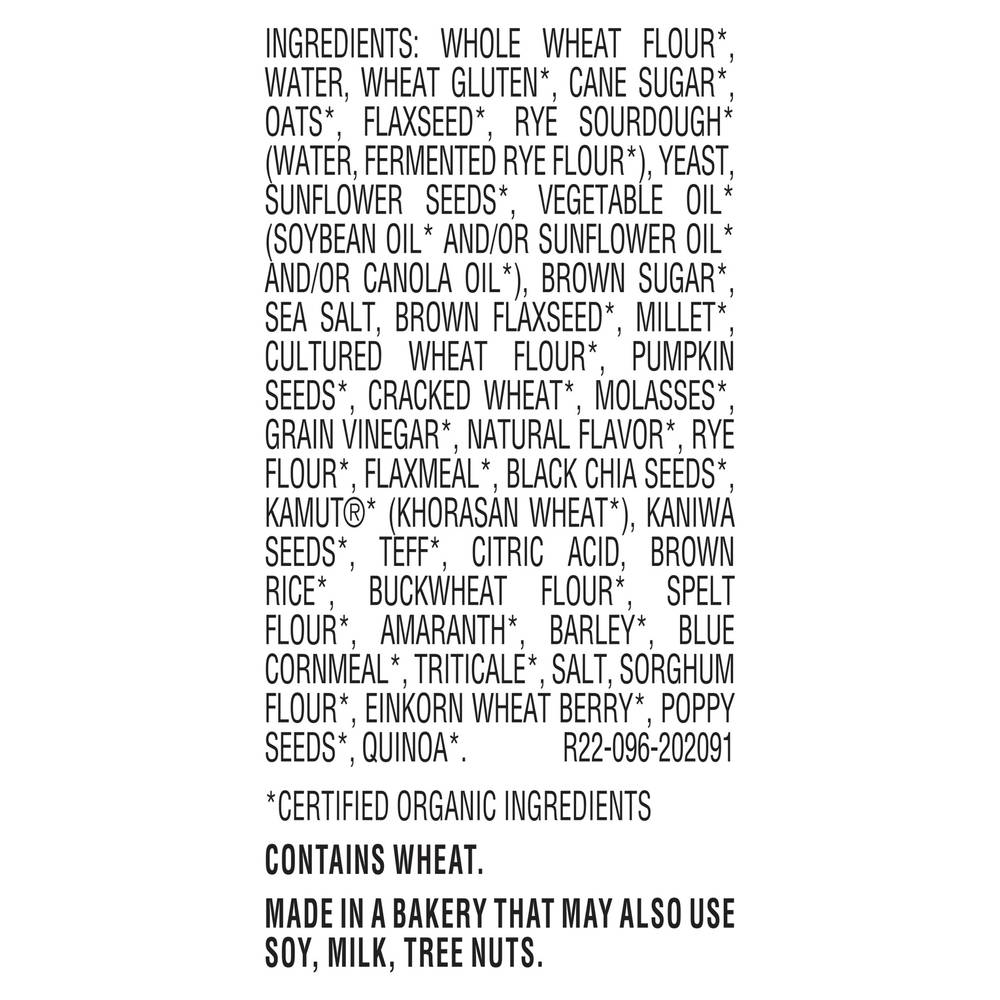 Ingredients: WHOLE WHEAT FLOUR, WATER, WHEAT GLUTEN, CANE SUGAR, OATS, FLAXSEED, RYE SOURDOUGH [WATER, FERMENTED RYE FLOUR], YEAST, SUNFLOWER SEEDS, VEGETABLE OIL [SOYBEAN OIL, SUNFLOWER OIL, CANOLA OIL], BROWN SUGAR, SEA SALT, BROWN FLAXSEED, MILLET, CULTURED WHEAT FLOUR, PUMPKIN SEEDS, CRACKED WHEAT, MOLASSES, GRAIN VINEGAR, NATURAL FLAVOR, RYE FLOUR, FLAXMEAL, BLACK CHIA SEEDS, KAMUT (KHORASAN WHEAT), KANIWA SEEDS, TEFF, CITRIC ACID, BROWN RICE, BUCKWHEAT FLOUR, SPELT FLOUR, AMARANTH, BARLEY, BLUE CORNMEAL, TRITICALE, SALT, SORGHUM FLOUR, EINKORN WHEAT BERRY, POPPY SEEDS, QUINOA. * CERTIFIED ORGANIC INGREDIENTS.