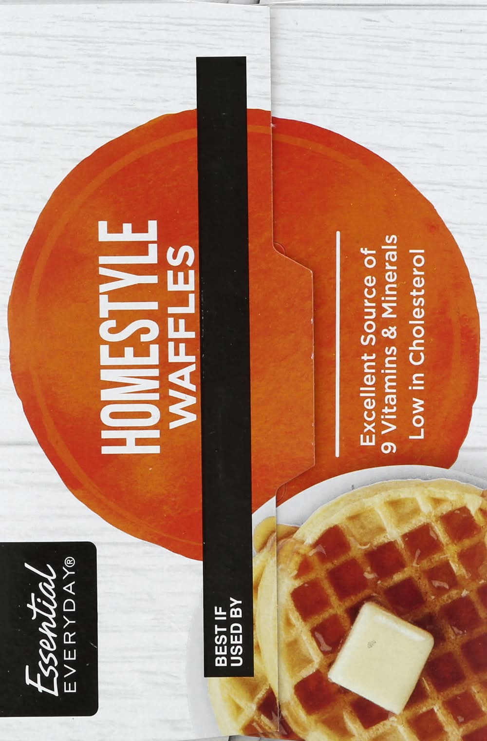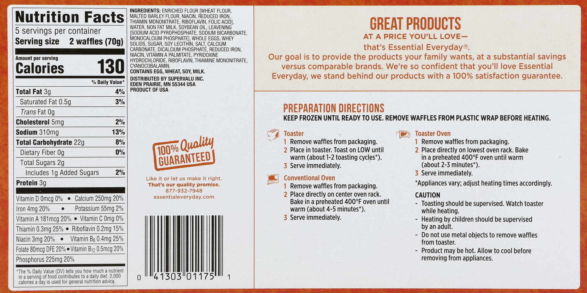 Excellent source of 9 vitamins & minerals. Low in cholesterol. Per 2 Waffles: 130 calories; 0.5 g sat fat (3% DV); 310 mg sodium (13 DV%); 2 g total sugars. Great Products: At a price you'll love — that's essential everyday. Our goal is to provide the products your family wants, at a substantial savings versus comparable brands. We're so confident that you'll love essential everyday, we stand behind our products with a 100% satisfaction guarantee. 100% Quality Guaranteed: Like it or let us make it right. That's our quality promise. essentialeveryday.com. Product of USA. Number of servings: 5