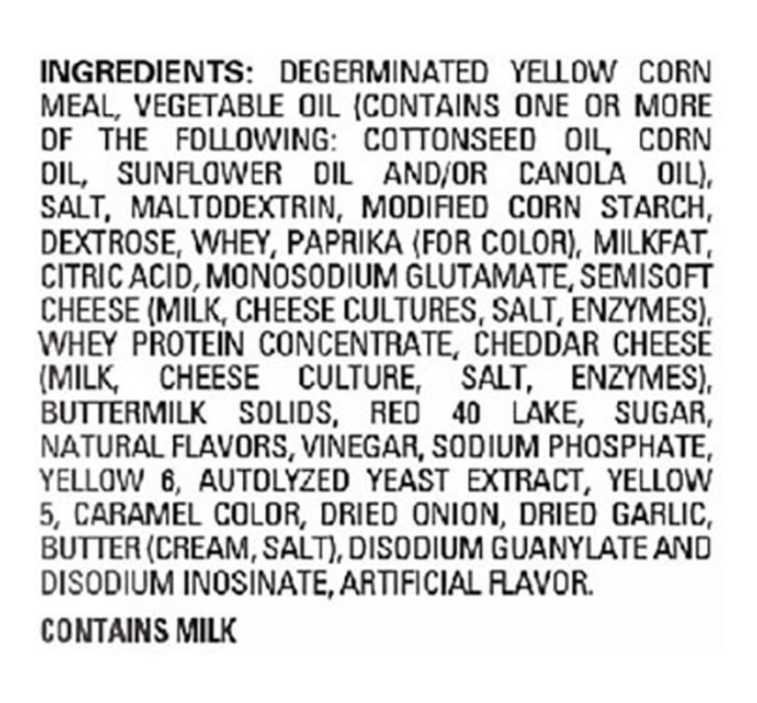 Ingredients: Degerminated Yellow Corn Meal, Vegetable Oil (Contains One or More of the Following: Cottonseed Oil, Corn Dil, Sunflower Dil and/or Canola Oil), Salt, Maltodextrin, Modified Corn Starch, Dextrose, Whey, Paprika (for Color), Milkfat, Citric Acid, Monosodium Glutamate, Semisoft Cheese (Milk, Cheese Cultures, Salt, Enzymes), Whey Protein Concentrate, Cheddar Cheese (Milk, Cheese Culture, Salt, Enzymes), Buttermilk Solids, Red 40 Lake, Sugar, Natural Flavors, Vinegar, Sodium Phosphate, Yellow 6, Autolyzed Yeast Extract, Yellow 5, Caramel Color, Dried Onion, Dried Garlic, Butter (Cream, Salt), Disodium Guanylate and Disodium Inosinate, Artificial Flavor Contains: Milk, Corn