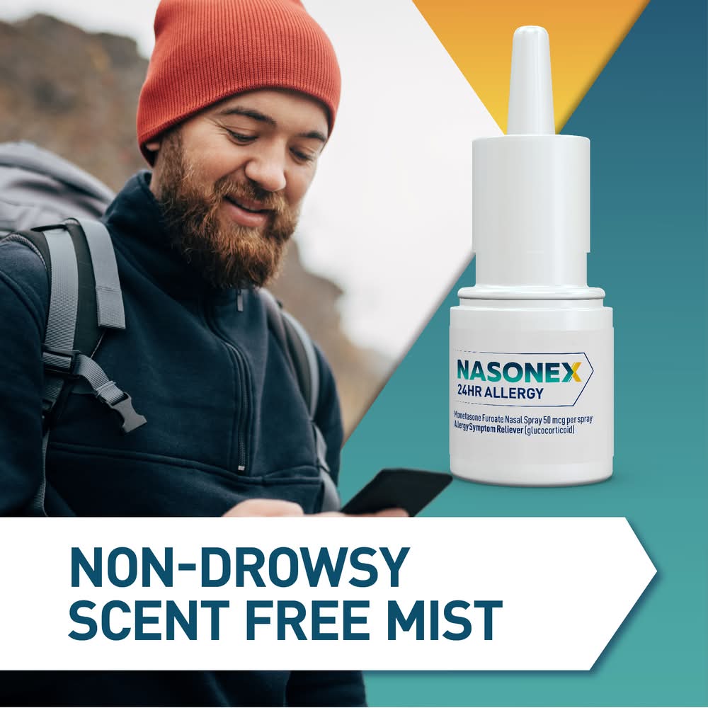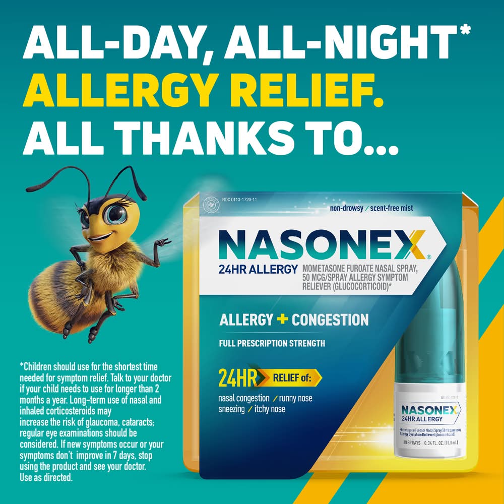 Take the sting out of allergies with Nasonex 24HR Allergy 60 spray in full prescription strength. Relieves nasal congestion, runny nose, sneezing and itchy nose. For hay fever, seasonal, indoor or outdoor allergies. Each dose alleviates allergies and congestion without leaving you feeling drowsy or sleepy. Celebrate normal with Nasonex!
