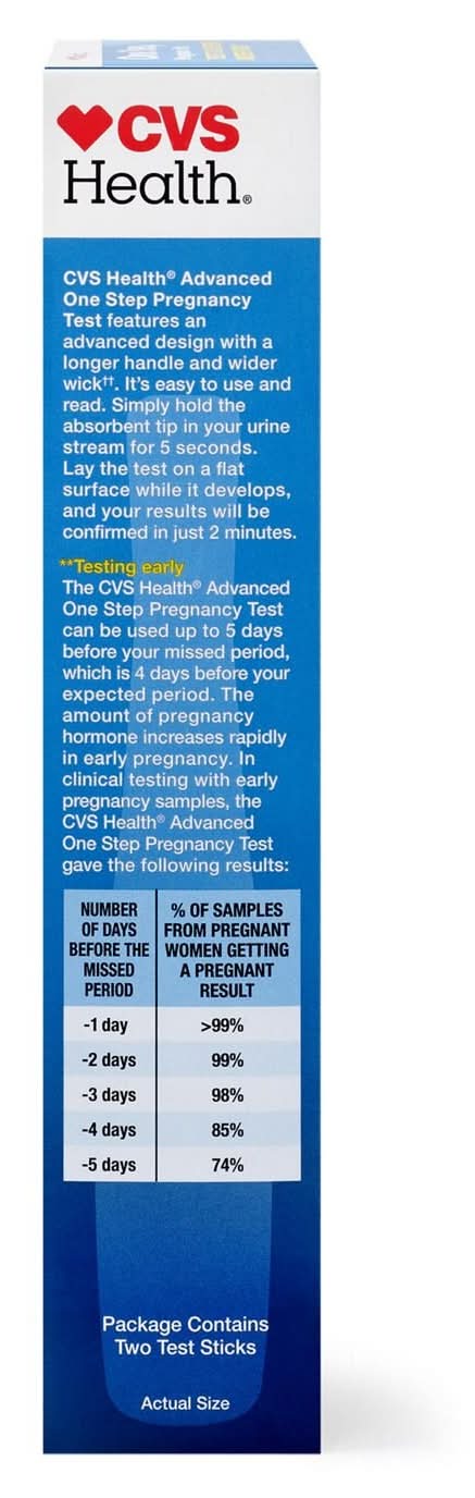 Cvs health advanced one step pregnancy test is designed for convenience and accuracy, equipped with floodguard technology. The kit includes two pregnancy tests along with an instruction insert provided in both english and spanish. The test features a user-friendly design, with a longer handle and wider wick compared to standard visual tests, facilitating ease of use and clear interpretation of results. Users can expect over 99% accuracy from the day of their expected period, with the ability to detect typical pregnancy hormone levels. The test allows for early detection, offering the option to administer the test up to 5 days before a missed period, which is 4 days before the expected period. Results can be read in just 2 minutes after laying the test on a flat surface following a 5-second exposure to the urine stream. This product is for in vitro diagnostic use only and is eligible for purchase with hsa/fsa funds. It should be stored at temperatures ranging from 36° to 86°f and must not be frozen. It is important to keep the test out of reach of children.