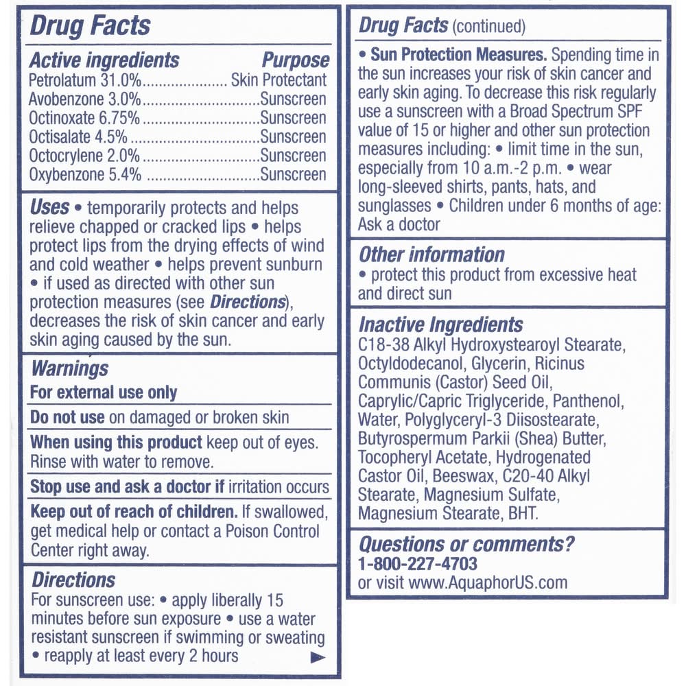 Ingredients: Active Ingredients: Petrolatum (31%) – Skin protectant, Avobenzone (3%), Octinoxate (6.75%), Octisalate (4.5%), Octocrylene (2%), Oxybenzone (5.4%) – Sunscreen Inactive Ingredients: C18-38 Alkyl Hydroxystearoyl Stearate, Octyldodecanol, Glycerin, Ricinus Communis (Castor) Seed Oil, Caprylic/Capric Triglyceride, Panthenol, Water, Polyglyceryl-3 Diisostearate, Butyrospermum Parkii (Shea) Butter, Tocopheryl Acetate, Hydrogenated Castor Oil, Beeswax, C20-40 Alkyl Stearate, Magnesium Sulfate, Magnesium Stearate, BHT Additives: Inactive Ingredients: C18-38 Alkyl Hydroxystearoyl Stearate Octyldodecanol Glycerin, Ricinus Communis Castor Seed Oil Caprylic/Capric Triglyceride Panthenol Water, Polyglyceryl-3 Diisostearate Butyrospermum Parkii Shea Butter Tocopheryl Acetate Hydrogenated Castor Oil, Beeswax C20-40 Alkyl Stearate Magnesium Sulfate Magnesium Stearate, BHT.