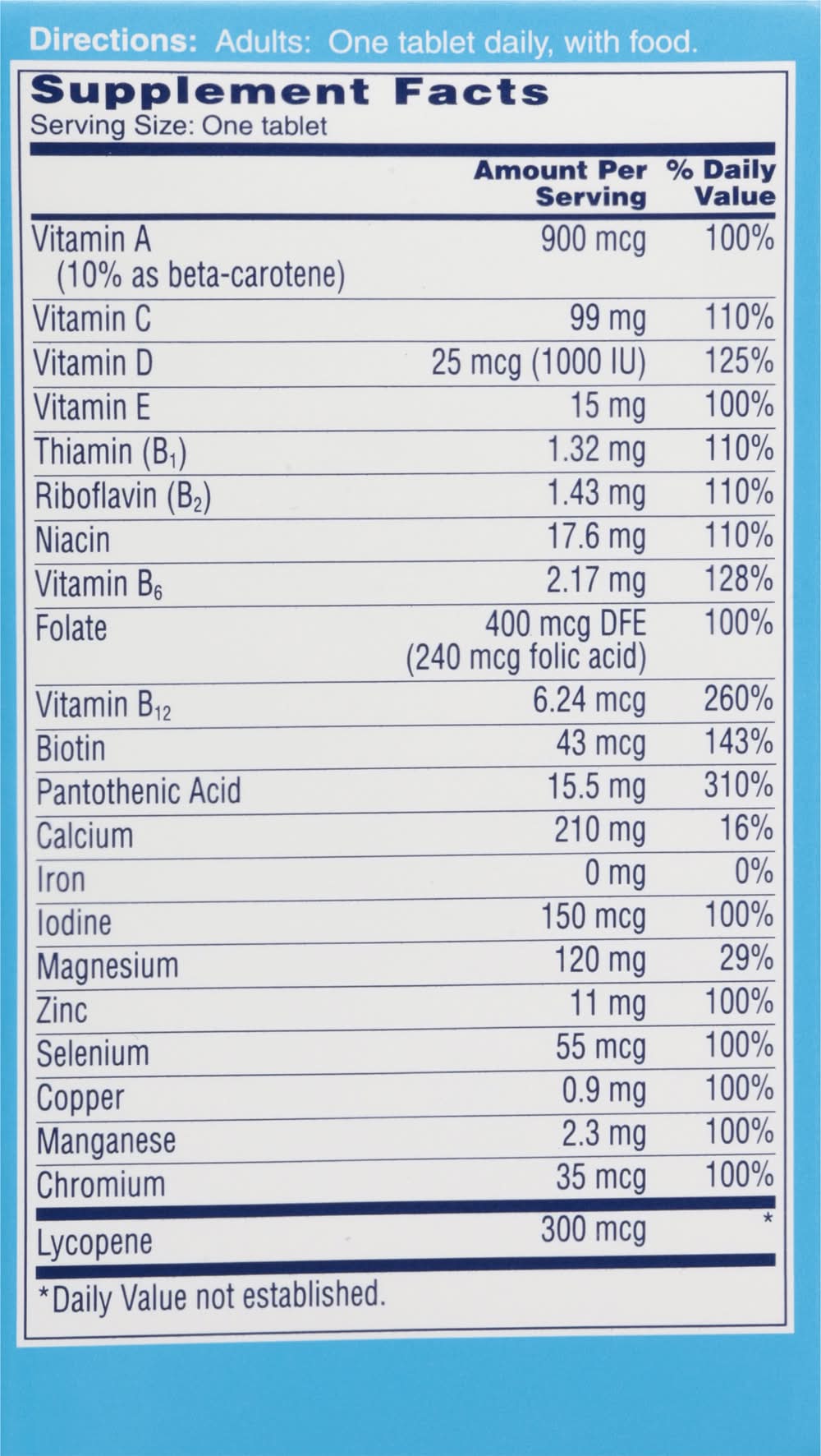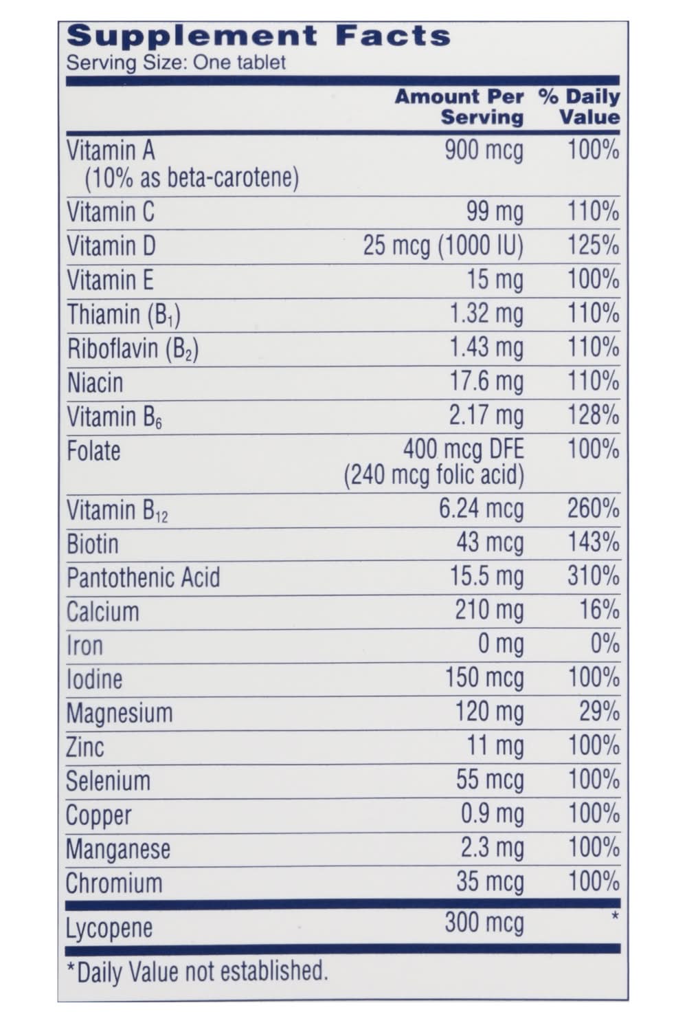 Ingredients: Calcium Carbonate, Magnesium Oxide, Microcrystalline Cellulose, Ascorbic Acid, Maltodextrin, DL-Alpha-Tocopheryl Acetate; Less than 2% of: Beta-Carotene, Biotin, Cholecalciferol, Chromium Chloride, Copper Sulfate, Croscarmellose Sodium, Cyanocobalamin, D-Calcium Pantothenate, Folic Acid, Gelatin, Hydroxypropyl Methylcellulose, Inulin, Lycopene, Manganese Sulfate, Medium Chain Triglycerides, Niacinamide, Polyvinylpolypyrrolidone, Potassium Lodide, Pyridoxine Hydrochloride, Riboflavin, Silicon Dioxide, Sodium Selenite, Stearic Acid, Thiamine Mononitrate, Vitamin A Acetate, Zinc Oxide