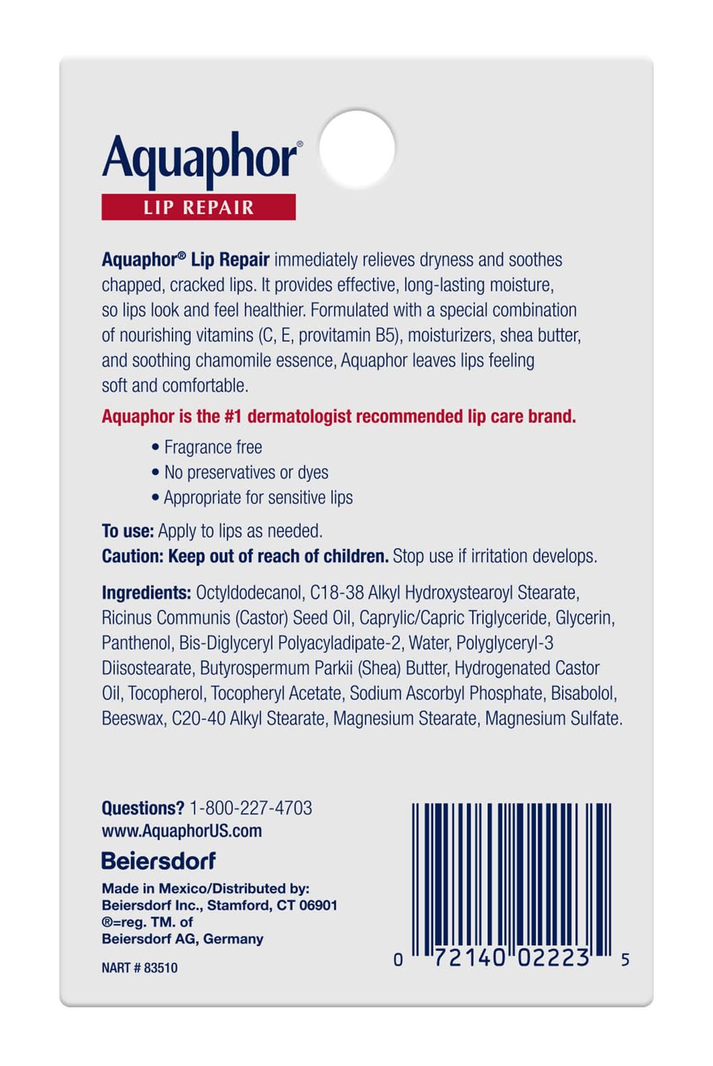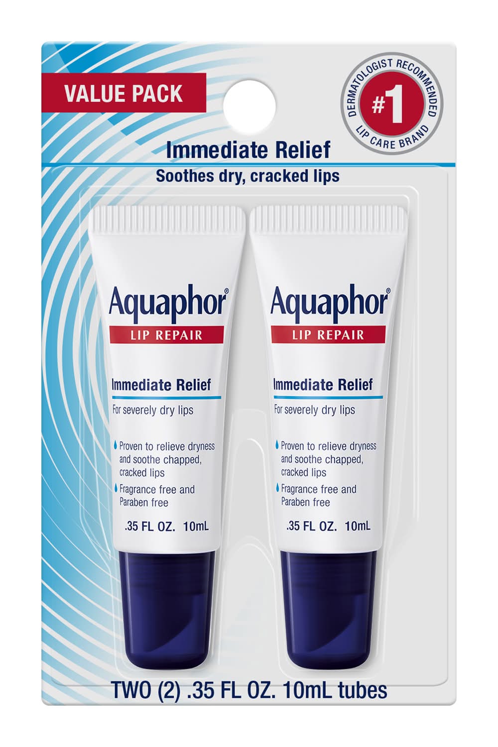 Aquaphor Lip Repair immediately relieves dryness and soothes chapped, cracked lips. It provides effective, long-lasting moisture, so lips look and feel healthier. Aquaphor is the #1 dermatologist-recommended lip care brand. Proven to relieve dryness and soothe chapped, cracked lips, it seals in moisture and helps prevent dryness. Formulated with nourishing vitamins, Shea Butter and soothing Chamomile essence for soft lips, it is specially formulated for sensitive lips. Preservative- and fragrance-free, this value pack contains two (2) .35oz tubes. Aquaphor Lip Repair Tube is a top-rated lip balm that soothes and protects dry, cracked and chapped lips Its advanced formula contains nourishing vitamins and natural ingredients to heal and moisturize lips This lip balm is fragrance-free and non-irritating, making it perfect for sensitive skin The convenient tube packaging allows for easy application and portability on-the-go Dermatologists recommend Aquaphor Lip Repair Tube as a go-to solution for dry and damaged lips Pack size: 2
