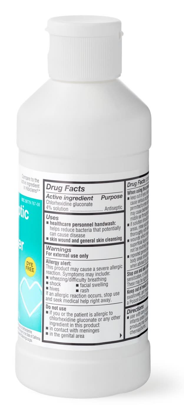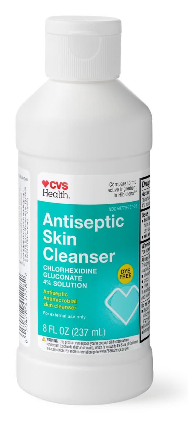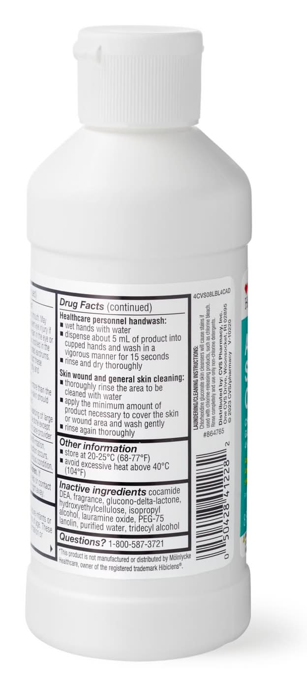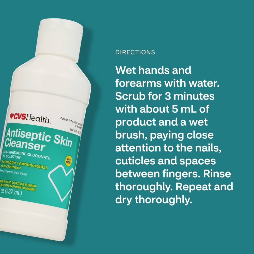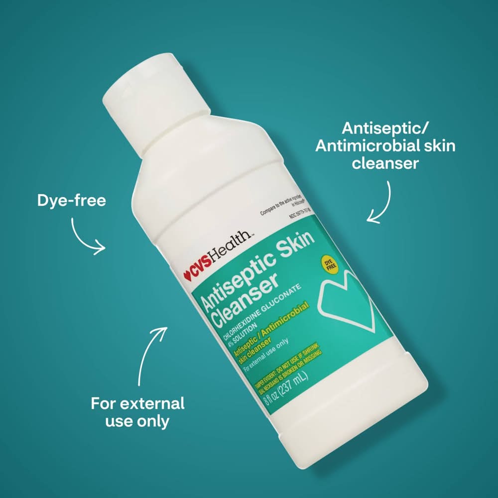CVS Health Antiseptic Skin Cleanser is an antiseptic and antimicrobial topical solution formulated with a chlorhexidine gluconate 4% solution. It is designed to reduce the number of microorganisms on the hands and forearms, making it suitable for both healthcare personnel as a handwash before engaging in surgical procedures or patient care, and for individuals at home. The cleanser assists in reducing bacteria that could potentially cause and spread disease. Additionally, it can be applied for cleaning skin wounds and for general skin cleansing. This product is dye-free and comes in an 8 fl oz bottle. It contains an active ingredient for antiseptic use.