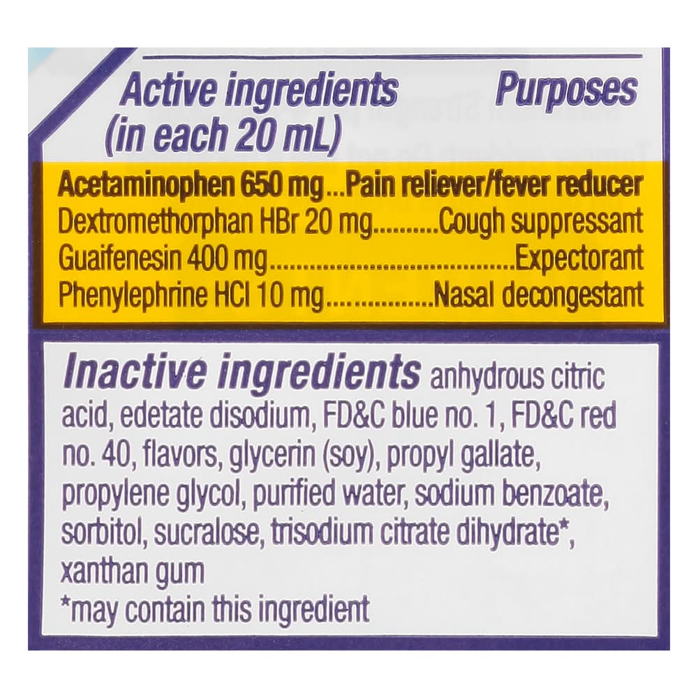 Ingredients: Active Ingredients: In Each 20 ml: Acetaminophen (650 mg), Dextromethorphan HBr (20 mg), Guaifenesin (400 mg), Phenylephrine HCl (10 mg). Purpose: Pain Reliever/Fever Reducer, Cough Suppressant, Expectorant, Nasal Decongestant. Inactive Ingredients: Anhydrous Citric Acid, Edetate Disodium, FDC Blue 1, FDC Red 40, Flavors, Glycerin, Propyl Gallate, Propylene Glycol, Purified Water, Sodium Benzoate, Sorbitol, Sucralose, Trisodium Citrate Dihydrate (May Contain this Ingredient), Xanthan Gum. Additives: Anhydrous Citric Acid, Edetate Disodium, FD&C Blue 1, FD&C Red 40, Flavors, Glycerin, Propyl Gallate, Propylene Glycol, Purified Water, Sodium Benzoate, Sorbitol, Sucralose, Trisodium Citrate Dihydrate (May Contain this Ingredient), Xanthan Gum.