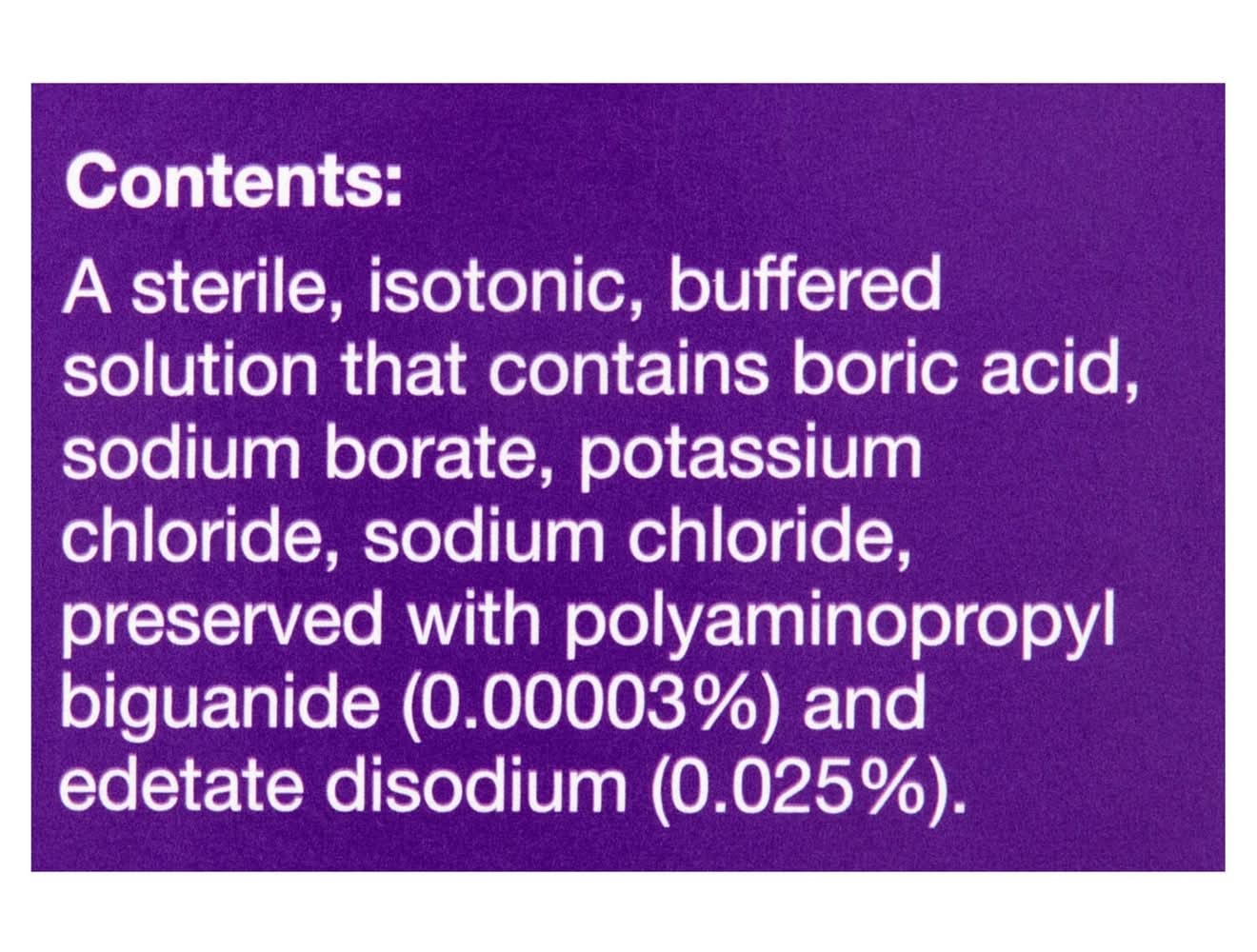 Ingredients: A Sterile, Isotonic, Buffered Solution That Contains Boric Acid, Sodium Borate, Potassium Chloride, Sodium Chloride, Preserved with Polyaminopropyl Biguanide (0.00003%) and Edetate Disodium (0.025 %)