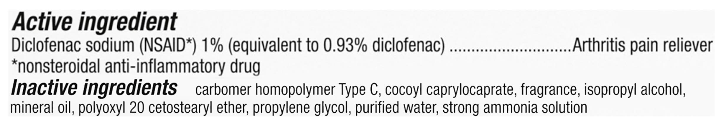 Ingredients: Active Ingredients: Diclofenac sodium (NSAID*) 1% (equivalent to 0.93% diclofenac) - Arthritis pain reliever *nonsteroidal anti-inflammatory drug; Inactive Ingredients: carbomer homopolymer Type C, cocoyl caprylocaprate, fragrance, isopropyl alcohol, mineral oil, polyoxyl 20 cetostearyl ether, propylene glycol, purified water, strong ammonia solution Additives: Carbomer Homopolymer Type C, Cocoyl Caprylocaprate Fragrance, Isopropyl Alcohol Mineral Oil, Polyoxyl 20 Cetostearyl Ether, ropylene Glycol Purified Water, Strong Ammonia Solution. *Nonsteroidal anti-inflammatory drug