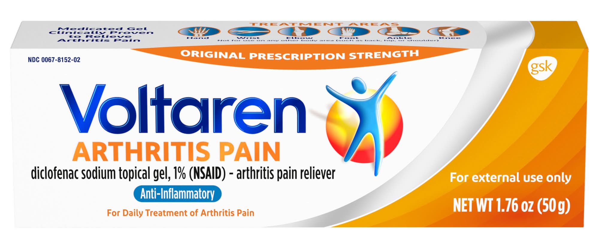 Diclofenac sodium topical gel, 1% (NSAID) - arthritis pain reliever. Anti-inflammatory. For daily treatment of arthritis pain. Medicated gel clinically proven to relieve arthritis pain. Treatment Areas Hand Wrist Elbow Foot Ankle Knee. Not for use on any other body area (such as back, hip, or shoulder).