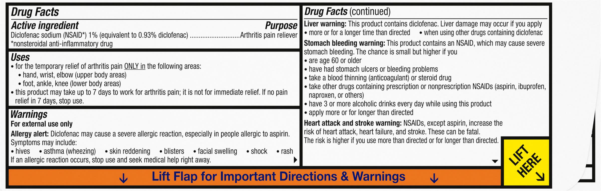 Directions: lift flap for important directions & warnings. use up to 21 days unless directed by your doctor. not for strains, sprains, bruises or sports injuries. this product has not been shown to work for these types of injuries. daily: for your arthritis pain: use 4 times per day every day. do not use on more than 2 body areas at the same time. per dose: use enclosed dosing card to measure a dose. for each upper body area (hand, wrist, or elbow) - squeeze out 2.25 inches (2 grams). for each lower body area (foot, ankle or knee) - squeeze out 4.5 inches (4 grams). read the enclosed user guide for complete instructions: use only as directed; do not use more than directed or for longer than directed; apply only to clean, dry skin that does not have any cuts, open wounds, infections or rashes; do not apply in same area as any other product; do not apply with external heat such as heating pad; do not apply a bandage over the treated area. store enclosed dosing card with your voltaren arthritis pain. the dosing card is re-usable. how to use: for arthritis pain only. use 4 times a day. may take up to 7 days to work for your arthritis pain. for use on no more than 2 body areas. use up to 21 days unless directed by your doctor.