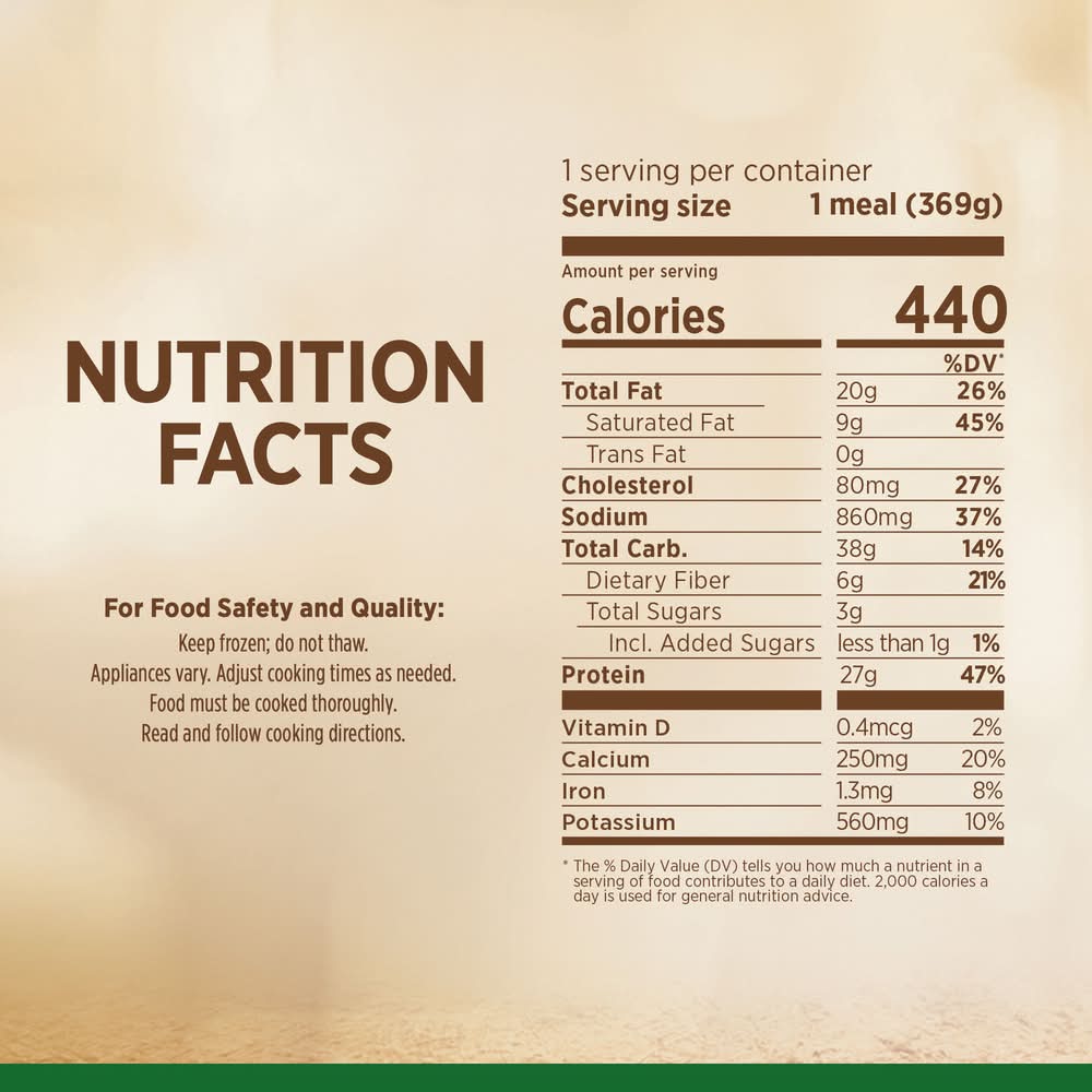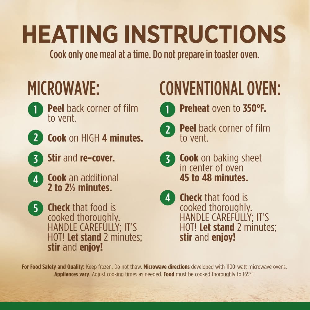 Directions for use: Microwave Oven (Cook only one at a time): 1: Peel back corner of film to vent. 2: Cook on high 5 minutes. 3: Stir and re-cover. 4: Cook an additional 1 to 2 minutes. 5: Check that food is cooked thoroughly. Handle carefully; it's hot! Let stand 2 minutes; stir and enjoy! Conventional Oven: Do not prepare in toaster oven. Preheat oven to 350 degrees F. Peel back corner of film to vent. Cook on baking sheet in center of oven 45 to 48 minutes. Check that food is cooked thoroughly. Handle carefully; it's hot! Let stand 2 minutes; stir and enjoy! For Food Safety and Quality: Keep frozen. Do not thaw. Microwave directions developed with 1100-watt microwave ovens. Appliances vary. Adjust cooking times as needed. Food must be cooked thoroughly to 165 degrees F. Keep frozen. Push to open. Storage recommendation: Keep frozen.