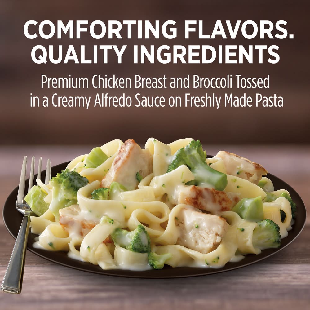 Enjoy a tasty spin on the comfort food you crave with Marie Callender's Fettuccini With Chicken and Broccoli. This delicious microwaveable meal features premium chicken breast and broccoli tossed in a rich alfredo sauce made with real cream on freshly made pasta. Perfect for any occasion including easy office lunches or quick frozen dinners, there are 27 grams of protein in each serving of this warm and hearty chicken and broccoli alfredo. Heat this easy-to-prepare frozen meal in the microwave or oven for a convenient pasta dish that contains no preservatives and no artificial flavors or colors. Enjoy warm, hearty ingredients and delicious homemade comfort food taste with Marie Callender’s.