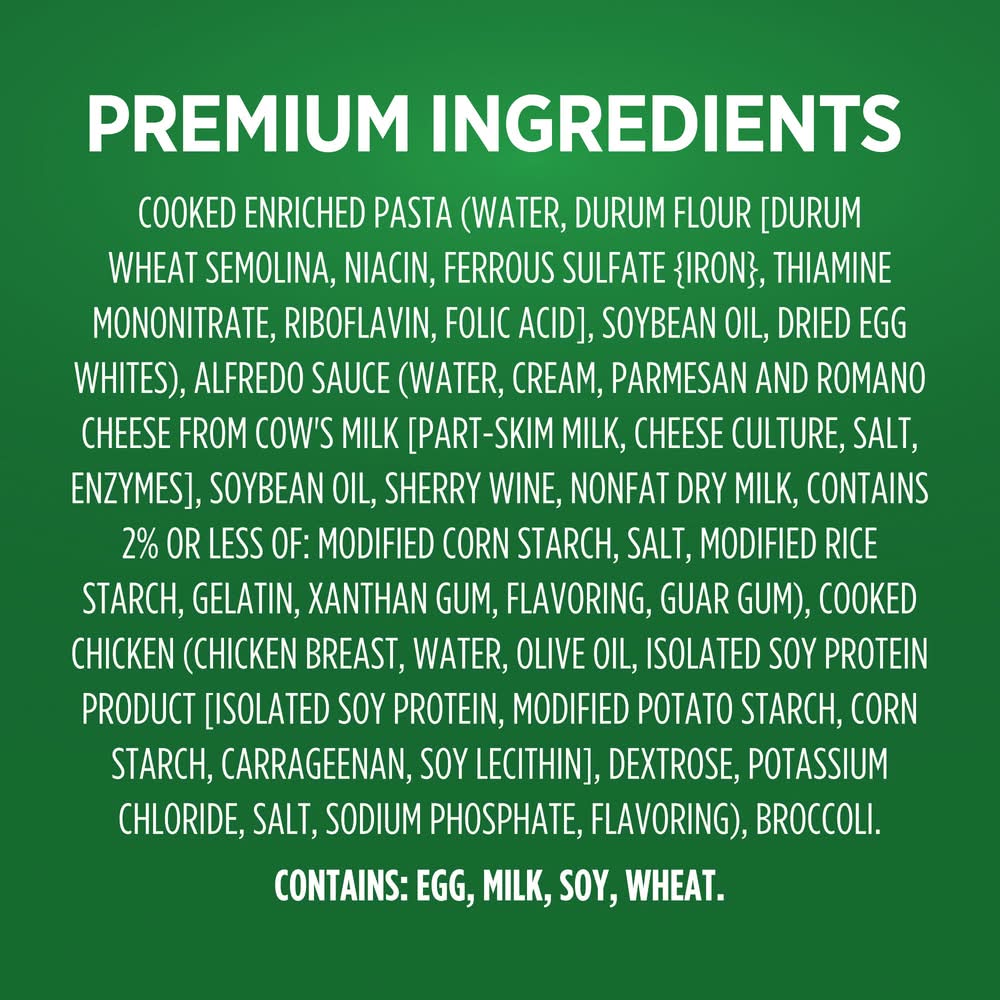 Ingredients: Cooked Enriched Pasta Water, Enriched Wheat Flour [Durum Wheat Semolina, Niacin, Ferrous Sulfate {Iron}, Thiamine Mononitrate, Riboflavin, Folic Acid], Soybean Oil, Dried Egg Whites, Sauce Water, Cream, Soybean Oil, Parmesan Cheese [Part-Skim Milk, Cheese Culture, Salt, Enzymes], Romano Cheese from Cow's Milk [Cultured Part-Skim Milk, Salt, Enzymes], Sherry Wine, Nonfat Dry Milk, Contains 2% or Less of: Modified Corn Starch, Salt, Parmesan Cheese Flavor [Parmesan Cheese {Pasteurized Milk, Cultures, Salt, Enzymes}, Water, Salt, Disodium Phosphate, Sodium Citrate], Modified Rice Starch, Gelatin, Enzyme Modified Cream [Cream, Water, Salt], Xanthan Gum, Guar Gum, Flavoring, Cooked Chicken Chicken Breast, Water, Olive Oil, Isolated Soy Protein Product [Isolated Soy Protein, Modified Potato Starch, Corn Starch, Carrageenan, Soy Lecithin], Dextrose, Potassium Chloride, Salt, Sodium Phosphate, Flavoring, Broccoli. Contains: Wheat, Soybeans, Eggs, Milk, Corn