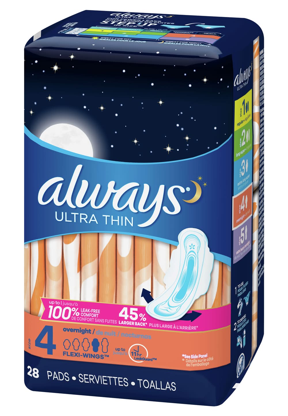 Up to 100% leak-free comfort. 45% larger back (see side panel) (vs. Always Ultra Thin Regular with Wings). Up to 11 hr Leak Guard. For fewer leaks step up in size. Panty Size: XS: Flow: Light; moderate; great for day. S: Light; great for day. M: Light; moderate; great for day. L: Light; great for day. XL+: Light; moderate; heavy; great for day. XS: Moderate; heavy; great for night. S: Moderate; heavy; great for night. M: Moderate; heavy; great for night. L: Moderate; heavy; great for night. XL+: Moderate; heavy; great for night. • Size: 4 • Procter & Gamble, Cincinnati, OH, 45202, Ph: 800-888-3115 • Packaging: Reusable