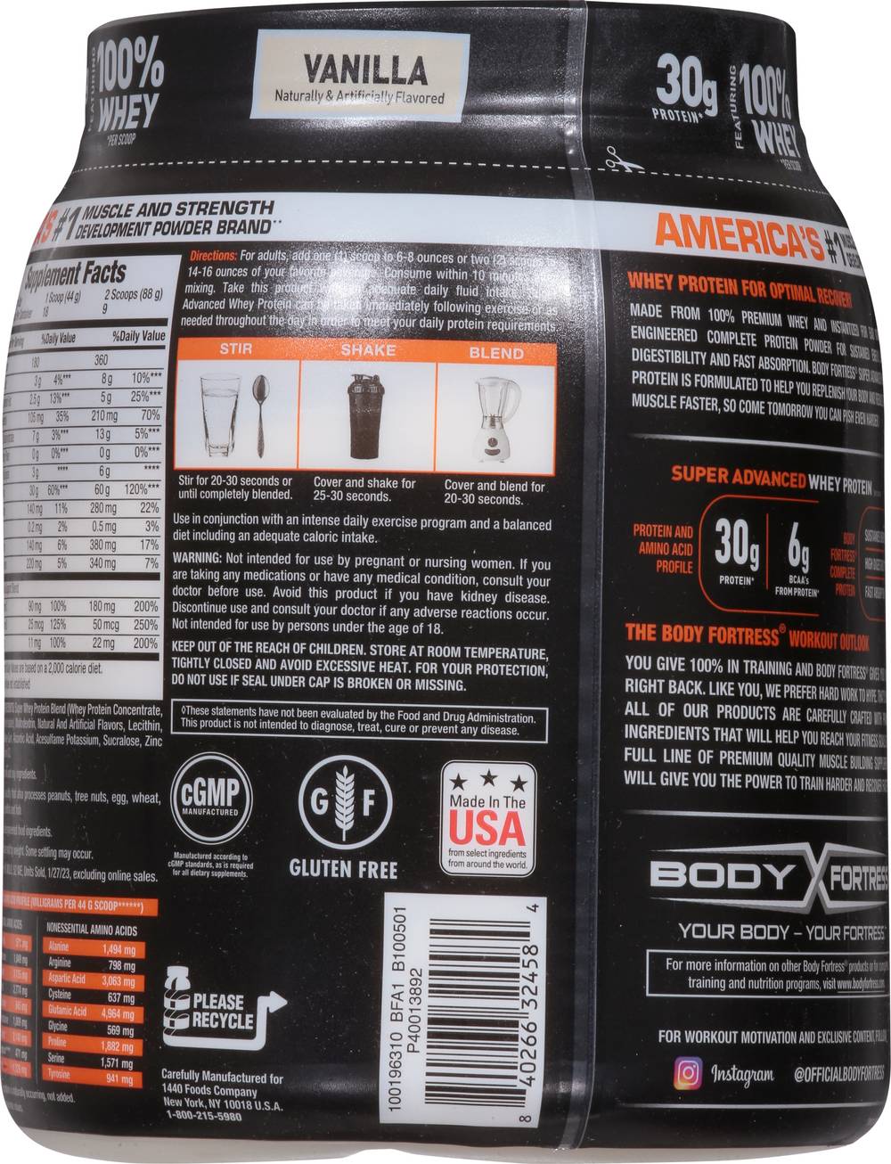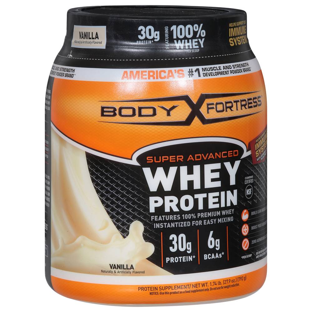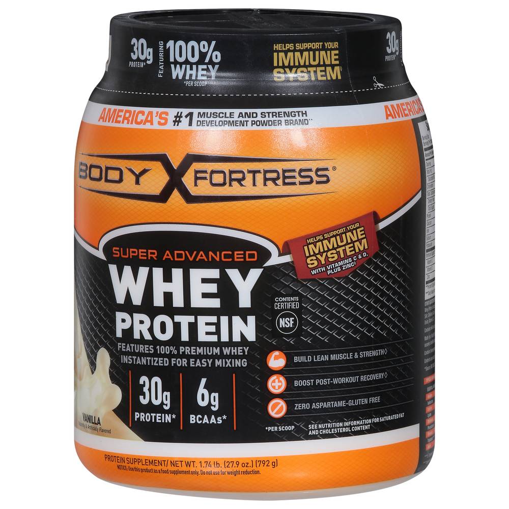 Protein Supplement. Featured 100% premium whey instantized for easy mixing. Naturally & artificially flavored. Build lean muscle & strength. Boost post-workout recovery. Body Fortress: Your body, your fortress. Whey Protein for optimal recovery. Made from 100% premium whey and instantized for whey mixing. Engineered complete protein powder for sustained energy, high digestibility and fast absorption. Body Fortress super advanced whey protein is formulated to help you replenish your body and rebuild lean muscle faster, so come tomorrow you can push even harder. Sustained energy. High digestibility. Fast absorption. The Body Fortress workout outlook. You give 100% in training and Body Fortress gives you 100% right back. Like you, we prefer hard work to hype. That's why all of our products are carefully crafted with proven ingredients that will help you reach your fitness goals. Our full line of premium quality muscle building supplements will give you the power to train harder and recover faster. Contents are sold by weight. Some settling may occur. NSF. Contents Certified. Packaging: Reusable