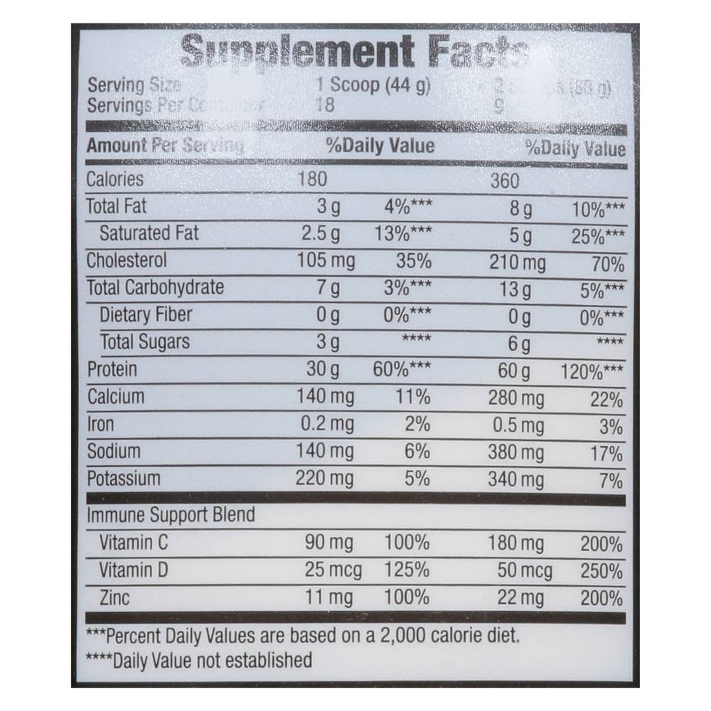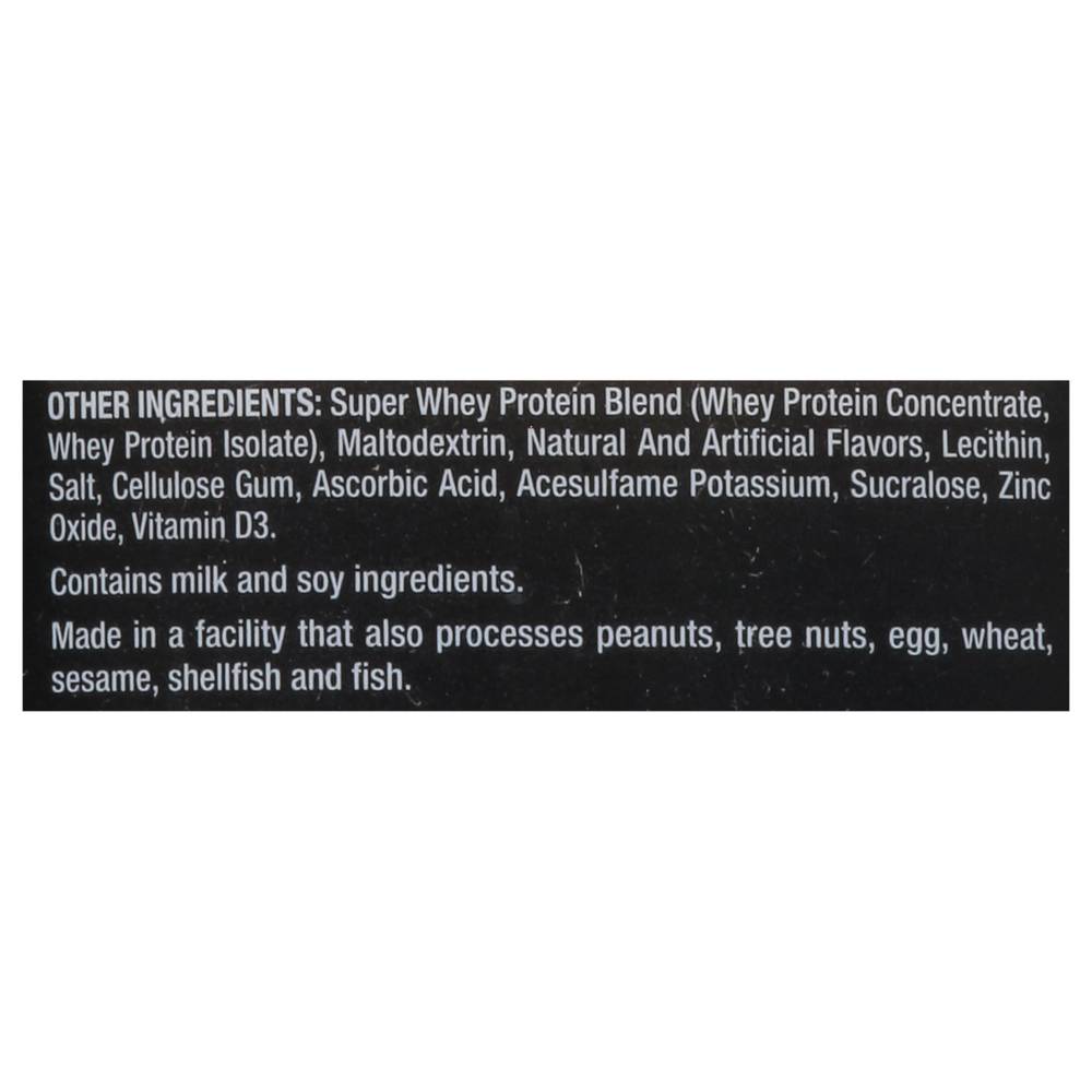 Ingredients: Other Ingredients: Super Whey Protein Blend (Whey Protein Concentrate, Whey Protein Isolate), Maltodextrin, Natural and Artificial Flavors, Sunflower Lecithin, Salt, Cellulose Gum, Ascorbic Acid, Acesulfame Potassium, Sucralose, Zinc Oxide, Vitamin D3 Contains: Eggs, Fish, Gluten, Milk, Nuts / Tree Nuts, Peanuts, Sesame, Soy, Wheat