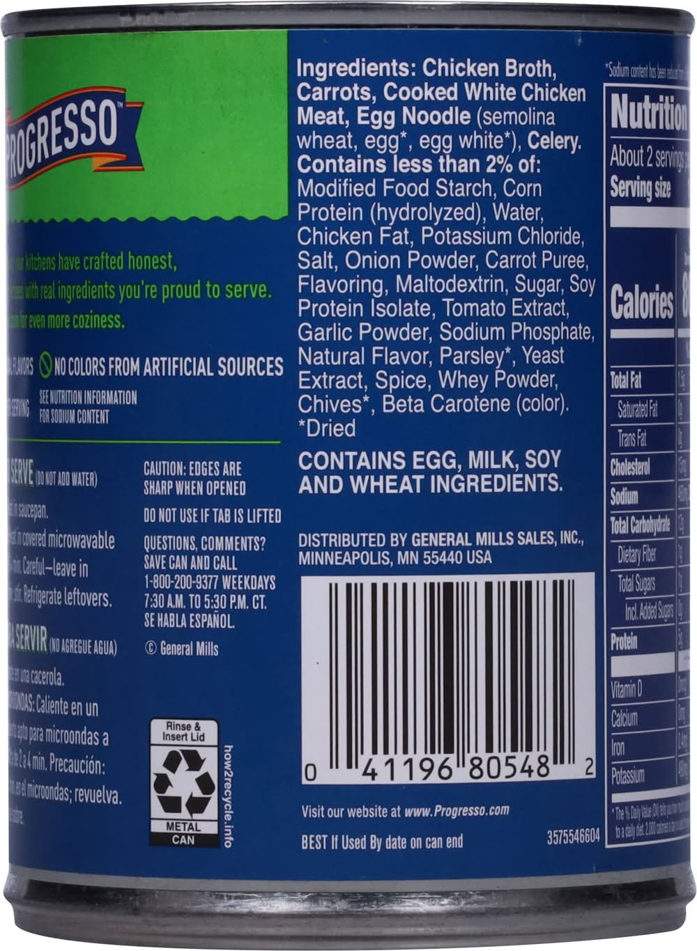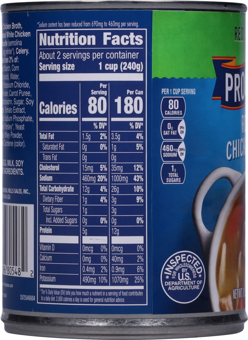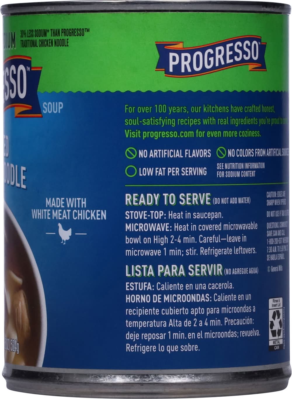 Quality foods. Heart healthy. 30% less sodium (sodium content has been reduced from 690 mg to 470 mg per serving) than Progresso traditional chicken noodle. While many factors affect heart disease, diets low in saturated fat and cholesterol may reduce the risk of this disease. 90 calories per serving. Low fat. No MSG added (Except that which occurs naturally in yeast extract and hydrolyzed vegetable proteins). No artificial flavors. Exchanges: 1 starch, 1/2 lean meat. Based on Academy of Nutrition and Dietetics and American Diabetes Association criteria. Visit our website at www.ProgressoSoup.com. Inspected for wholesomeness by US Department of Agriculture. Heart healthy. 30% less sodium than Progresso traditional chicken noodle. 90 calories per serving. Low fat. No MSG added (Except that which occurs naturally in yeast extract and hydrolyzed vegetable proteins). No artificial flavors. Exchanges: 1 starch, 1/2 lean meat. Inspected for wholesomeness by US Department of Agriculture. Packaging: Reusable