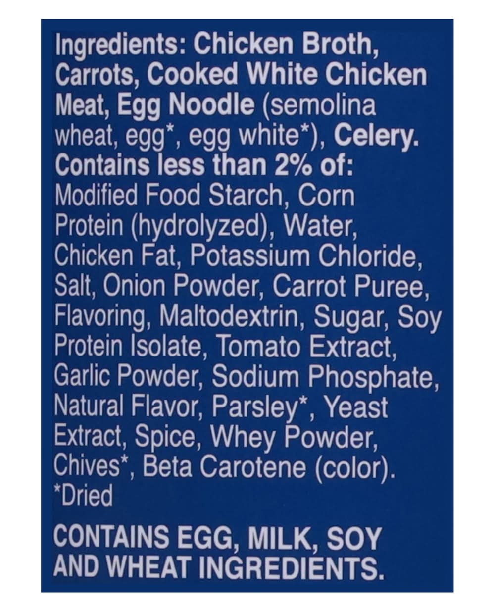 Ingredients: Chicken Broth, Carrots, Cooked White Chicken Meat, Egg Noodle (Semolina Wheat, Egg*, Egg White*), Celery. Contains Less than 2% of: Modified Food Starch, Corn Protein (Hydrolyzed), Water, Chicken Fat, Potassium Chloride, Salt, Onion Powder, Carrot Puree, Flavoring, Maltodextrin, Sugar, Soy Protein Isolate, Tomato Extract, Garlic Powder, Sodium Phosphate, Natural Flavor, Parsley*, Yeast Extract, Spice, Whey Powder, Chives*, Beta Carotene (Color). * Dried Contains: Eggs, Milk, Wheat, Soybeans