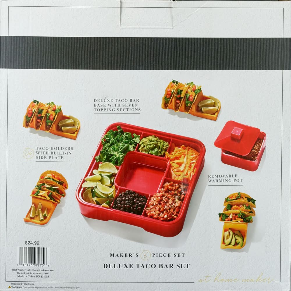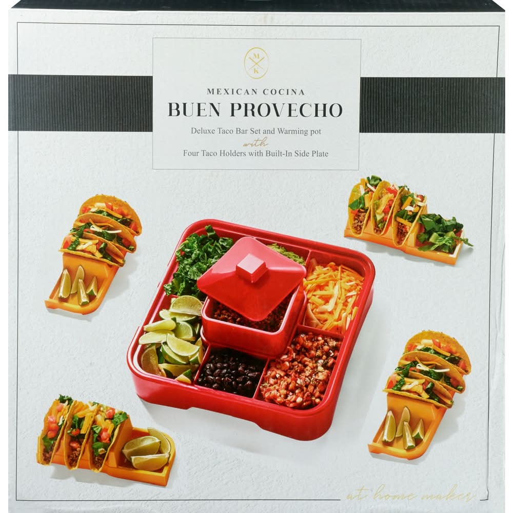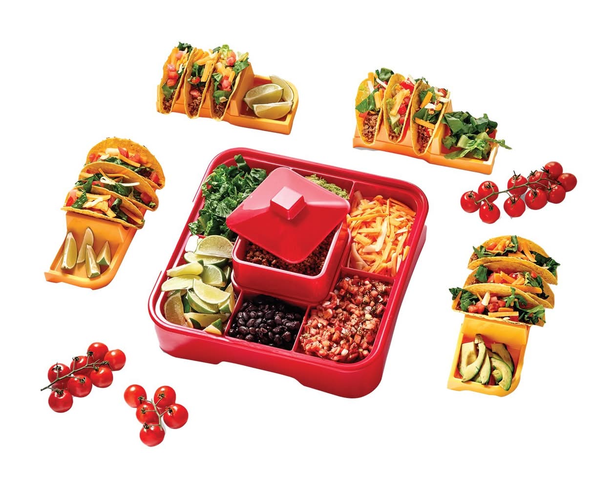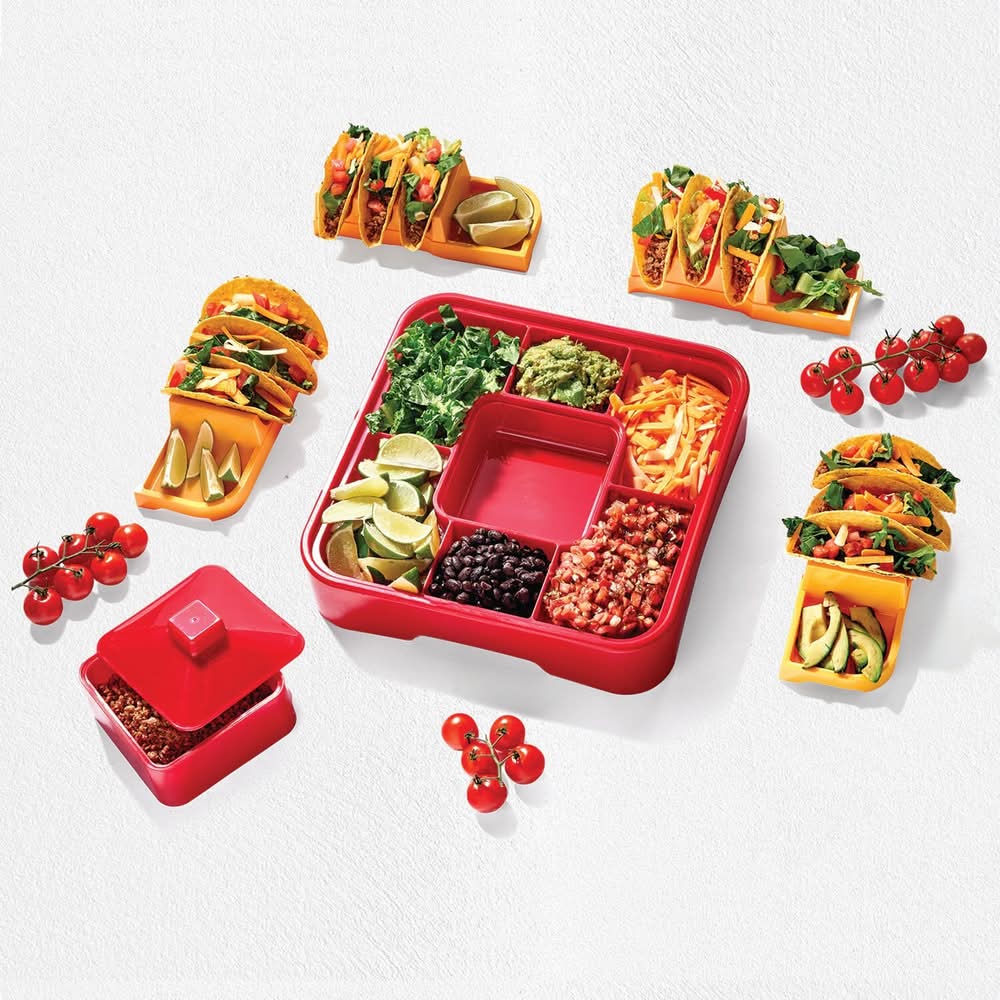Taco Tuesday, or any other night, will be fun and easy with this trendy taco kit. The 4 holders make it easy to have extra toppings at hand with the built in side plate. With each holder holding 3 tacos it's easy to feed the whole family. 6-piece set Deluxe base with 7 topping sections 4 taco holders with built-in side plates Removable warming pot