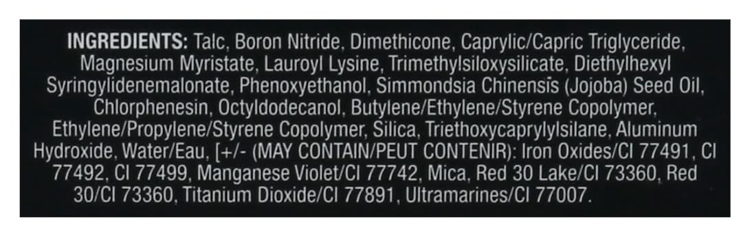 Ingredients: Talc, Boron Nitride, Dimethicone, Caprylic/Capric Triglyceride, Magnesium Myristate, Lauroyl Lysine, Trimethylsiloxysilicate, Diethylhexyl Syringylidenemalonate, Phenoxyethanol, Simmondsia Chinensis (Jojoba) Seed Oil, Chlorphenesin, Octyldodecanol, Butylene/Ethylene/Styrene Copolymer, Ethylene/Propylene/Styrene Copolymer, Silica, Triethoxycaprylylsilane, Aluminum Hydroxide, Water/Eau, [+/- (May Contain/Peut Contenir): Iron Oxides/CI 77491, CI 77492, CI 77499, Manganese Violet/CI 77742, Mica, Red 30 Lake/CI 73360, Red 30/CI 73360, Titanium Dioxide/CI 77891, Ultramarines/CI 77007