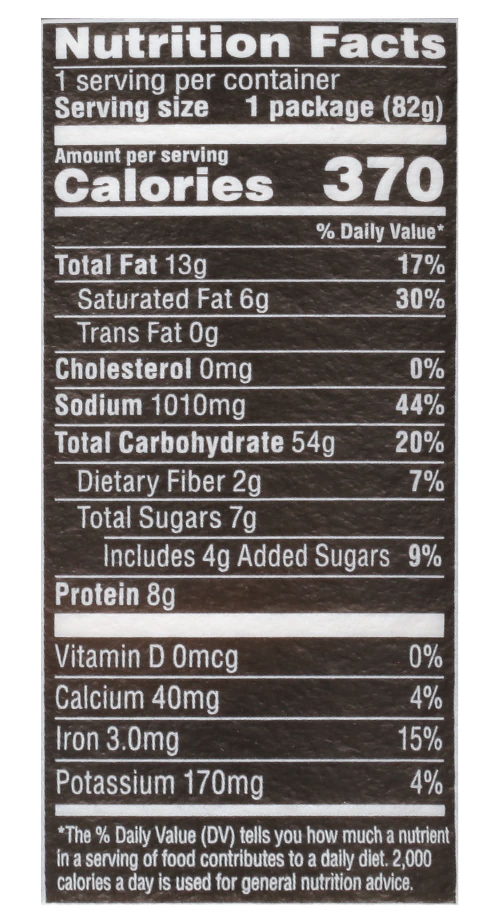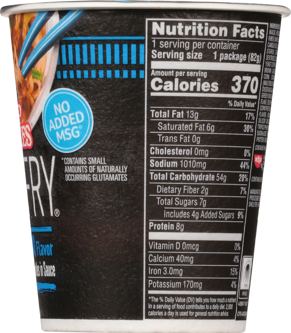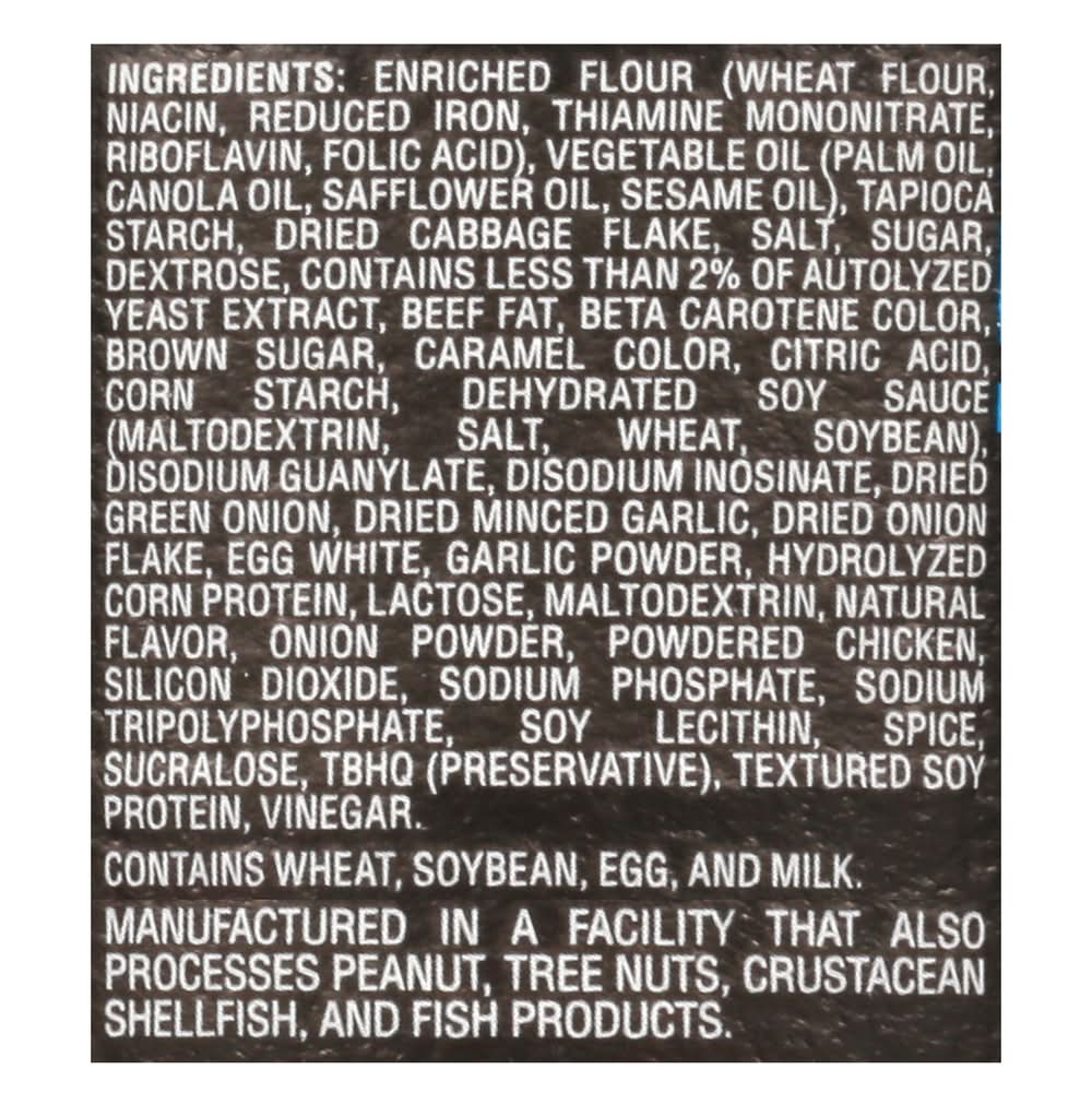 Ingredients: Enriched Flour (Wheat Flour, Niacin, Reduced Iron, Thiamine Mononitrate, Riboflavin, Folic Acid), Vegetable Oil (Palm Oil, Canola Oil, Safflower Oil, Sesame Oil), Tapioca Starch, Dried Cabbage Flake, Salt, Sugar, Dextrose, Contains Less than 2% of Autolyzed Yeast Extract, Beef Fat, Beta Carotene Color, Brown Sugar, Caramel Color, Citric Acid, Corn Starch, Dehydrated Soy Sauce (Maltodextrin, Salt, Wheat, Soybean), Disodium Guanylate, Disodium Inosinate, Dried Green Onion, Dried Minced Garlic, Dried Onion Flake, Egg White, Garlic Powder, Hydrolyzed Corn Protein, Lactose, Maltodextrin, Natural Flavor, Onion Powder, Powdered Chicken, Silicon Dioxide, Sodium Phosphate, Sodium Tripolyphosphate, Soy Lecithin, Spice, Sucralose, TBHQ (Preservative), Textured Soy Protein, Vinegar Contains: Wheat, Soybeans, Eggs, Milk, Lactose, Corn, Peanuts, Tree Nuts, Crustacean Shellfish, Fish