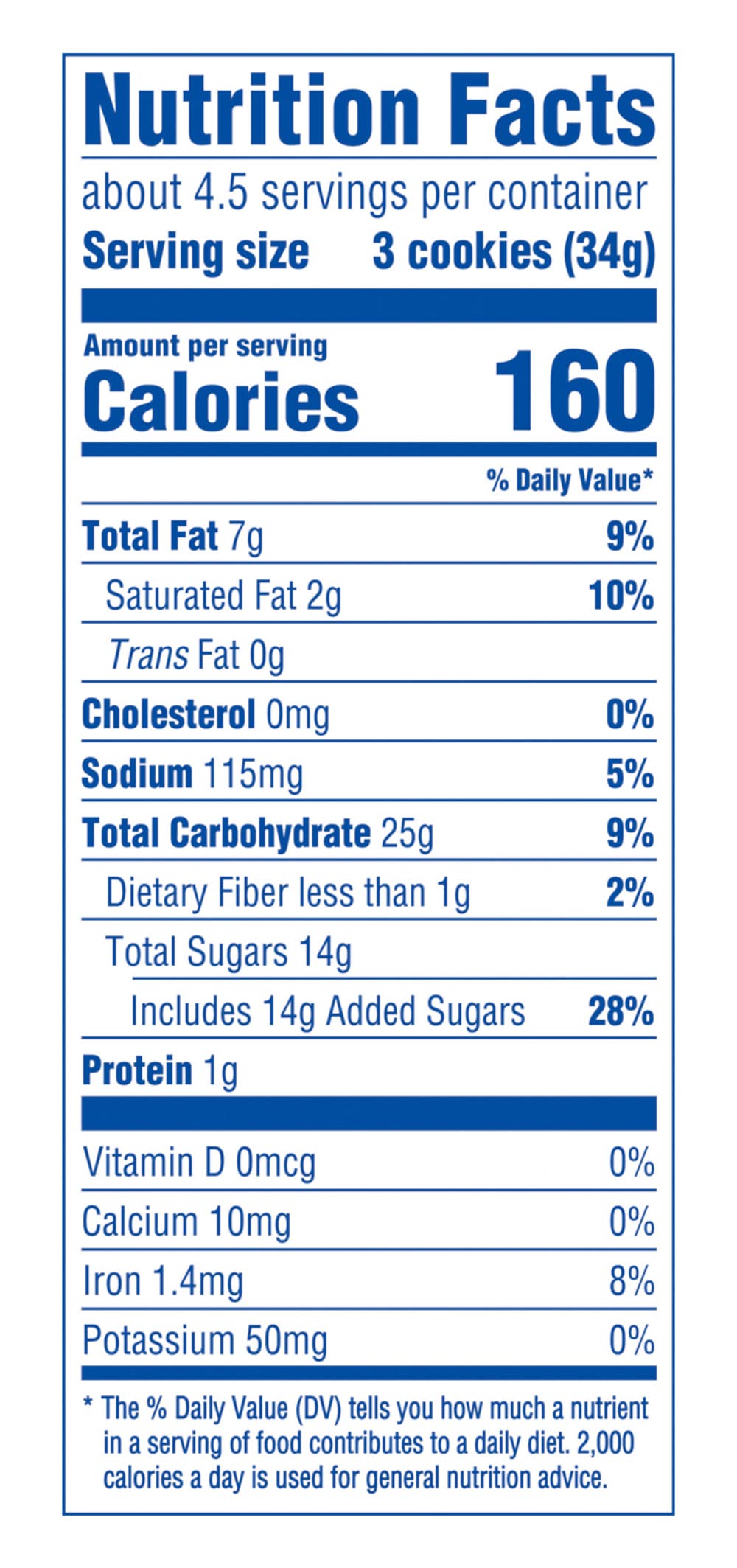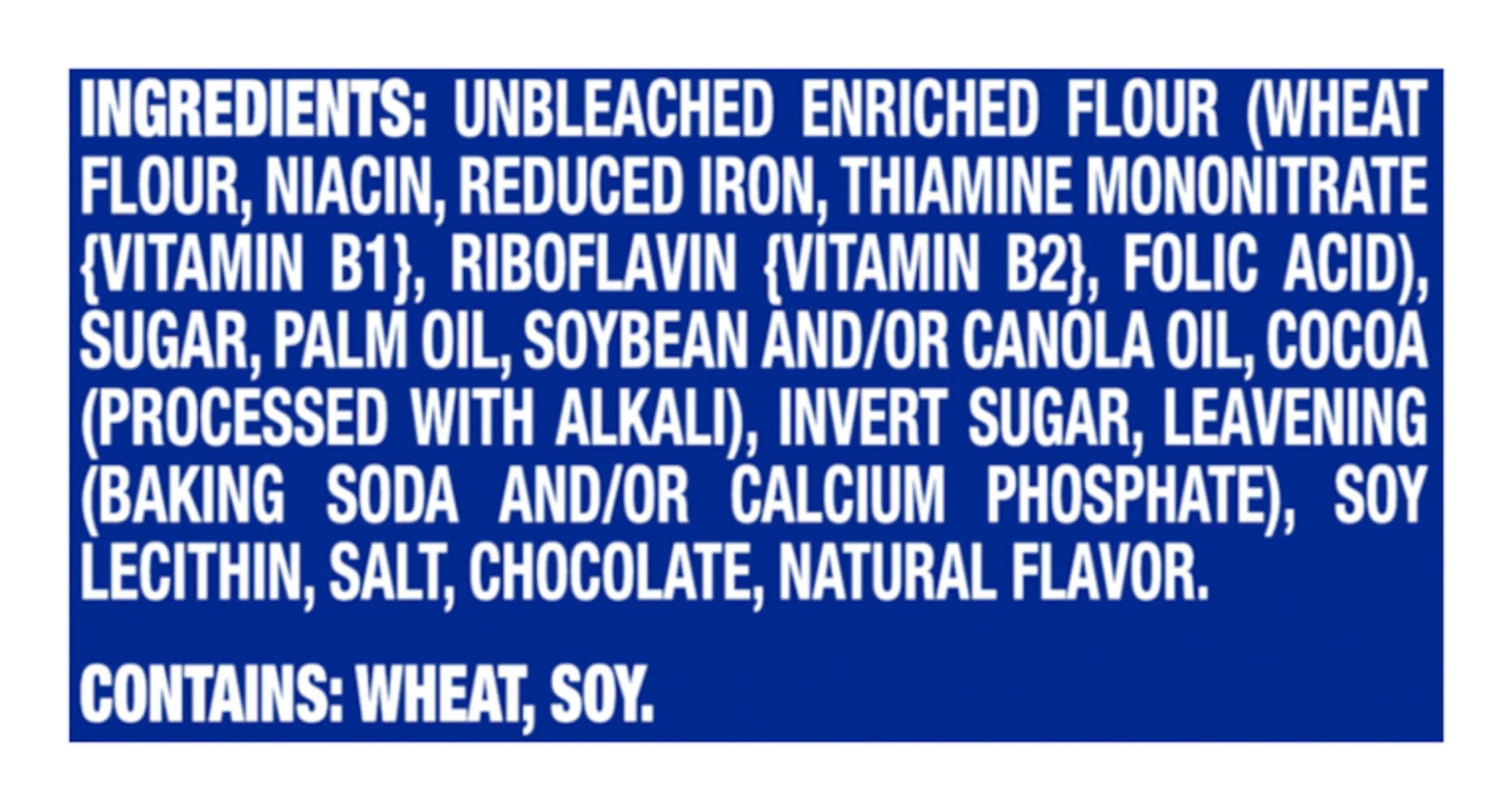 Ingredients: INGREDIENTS: UNBLEACHED ENRICHED FLOUR (WHEAT FLOUR, NIACIN, REDUCED IRON, THIAMINE MONONITRATE [VITAMIN B1], RIBOFLAVIN [VITAMIN B2], FOLIC ACID), SUGAR, PALM OIL, SOYBEAN AND, OR CANOLA OIL, COCOA (PROCESSED WITH ALKALI), INVERT SUGAR, LEAVENING (BAKING SODA AND/OR CALCIUM PHOSPHATE), SOY LECITHIN, SALT, CHOCOLATE, NATURAL FLAVOR. CONTAINS: WHEAT, SOY. Contains: CONTAINS: WHEAT, SOY.
