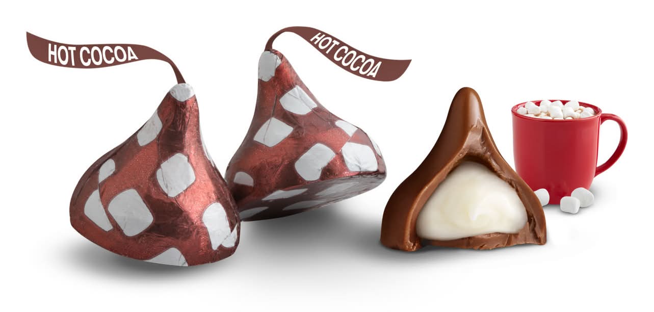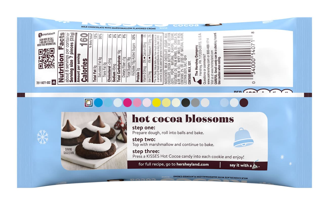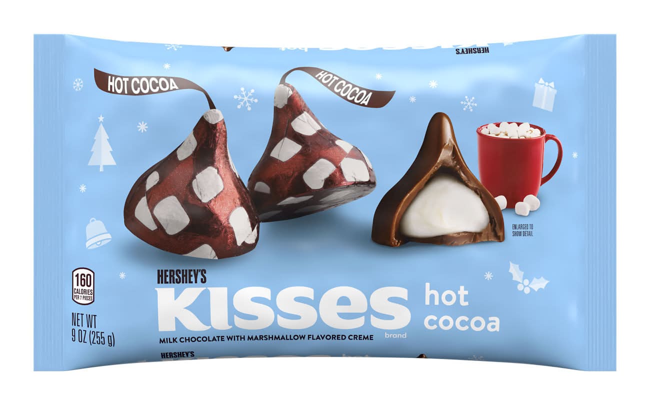 Share a cup and a kiss with your loved ones this holiday season with Hershey's Kisses milk chocolate hot cocoa flavored candies filled with marshmallow flavored creme. As sweet and welcoming as a warm hug during the winter season, these milk chocolate candies are the perfect companion to your favorite mug of hot chocolate. Each luscious treat in this bag is filled with marshmallow flavored creme and individually wrapped in foil decorated with adorable marshmallow illustrations. Sure to delight all chocolate lovers, these hot chocolate candies are ideal for filling a Christmas candy bowl, snack drawer or stocking. Contains one (1) 9-ounce bag of Hershey's Kisses Hot Cocoa Milk Chocolate with Marshmallow Flavored Creme Christmas Candy Fill candy dishes, snack drawers and lunch boxes all season long with milk chocolate and marshmallow flavored creme cocoa treats Kosher milk chocolate and marshmallow flavored creme Hershey's Kisses candies individually wrapped for lasting freshness Pack birthday party favors, New Year's candy dishes and anniversary dessert platters with Hershey's Kisses Hot Cocoa candies for a sweet marshmallow flavored creme surprise Stuff Christmas stockings, hot chocolate mugs and party favors with Hershey's Kisses milk chocolate and marshmallow flavored creme Christmas candy for a delicious seasonal surprise that puts everyone in the holiday spirit Place a Hershey's Kisses Hot Cocoa milk chocolate treat on top of each holiday themed brownie or cookie you bake for an extra sweet addition that takes the cake this Christmas The Hershey Company, Hershey, PA, 17033-0815