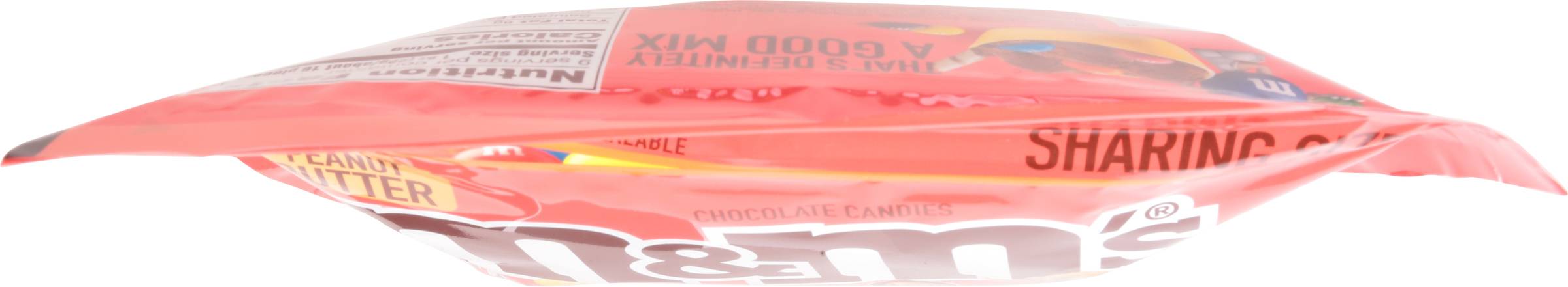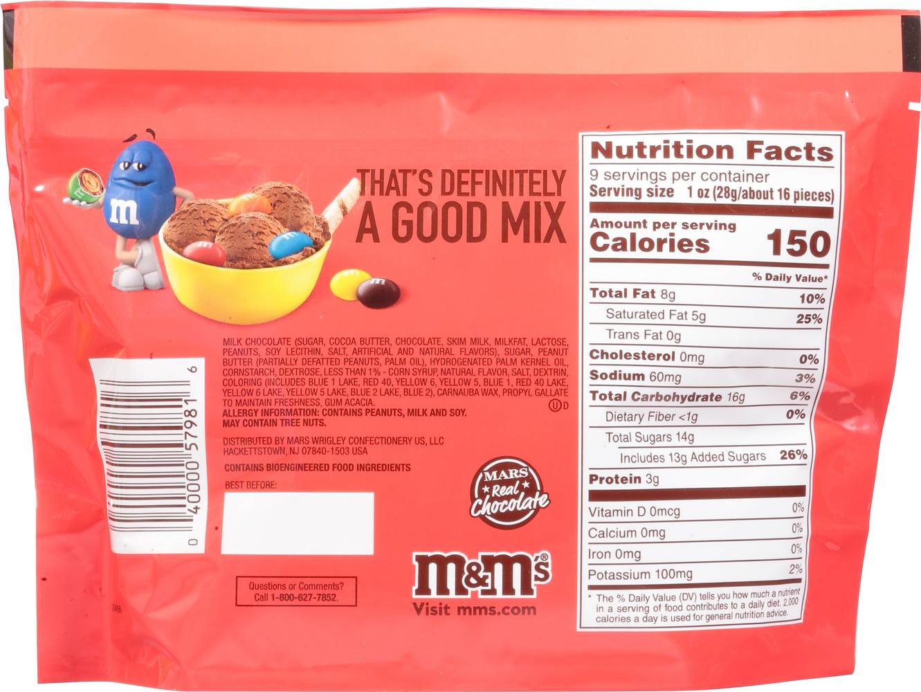 Sharing Size Candies feature a blend of peanut butter and chocolate flavors. Each serving contains 150 calories, 5 grams of saturated fat, 60 milligrams of sodium, and 14 grams of total sugars. The package provides approximately 9 servings and includes bioengineered food ingredients. These candies are made with Mars real chocolate. Flavor: Peanut butter