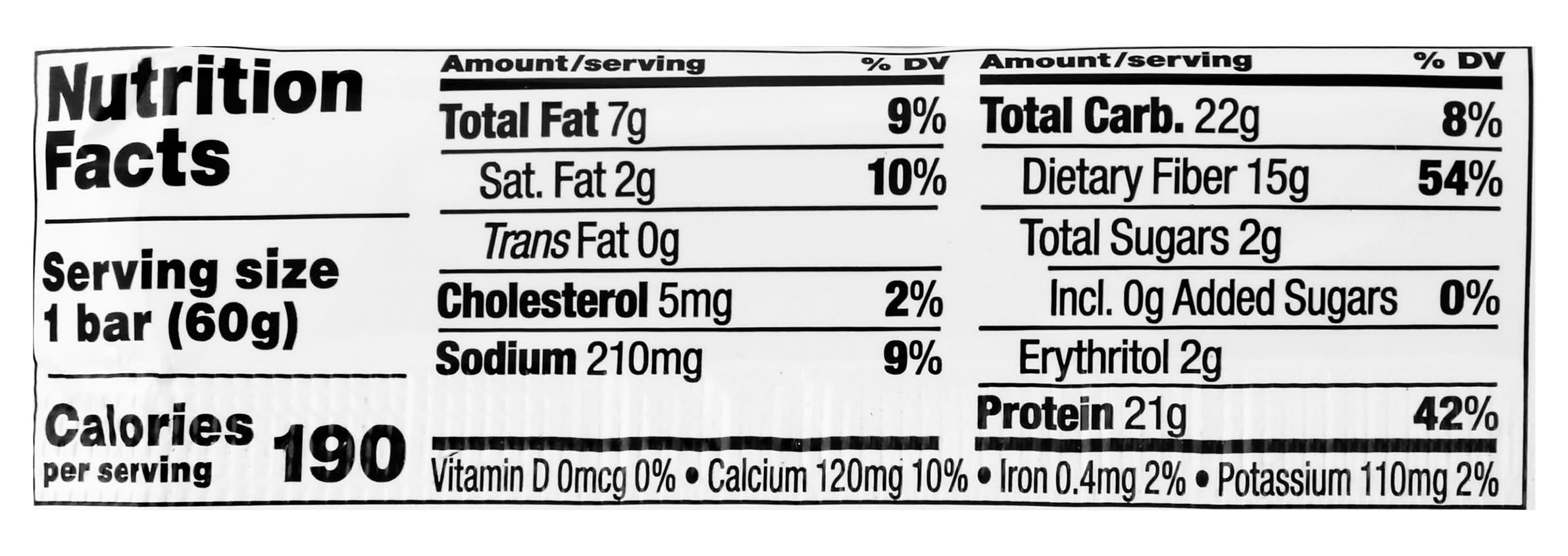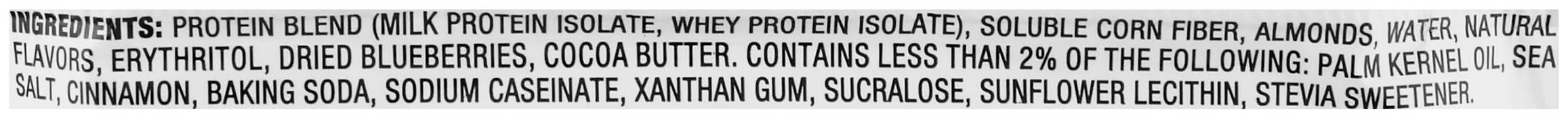 Ingredients: Protein Blend (Milk Protein Isolate, Whey Protein Isolate), Soluble Corn Fiber, Almonds, Water, Natural Flavors, Erythritol, Dried Blueberries, Cocoa Butter, Contains Less than 2% of the Following: Palm Kernel Oil, Sea Salt, Cinnamon, Baking Soda, Sodium Caseinate, Xanthan Gum, Sucralose, Sunflower Lecithin, Stevia Sweetener