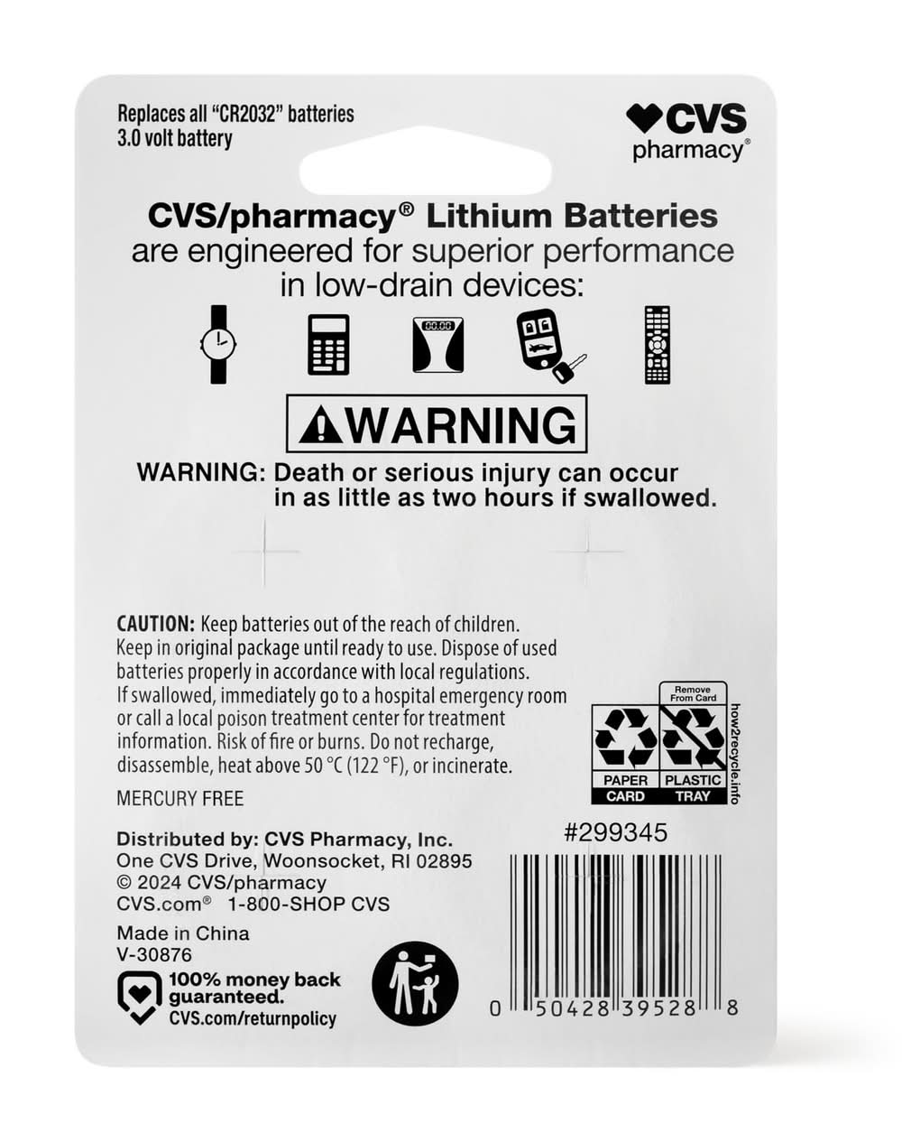 Introducing the CVS Lithium CR2032 Battery, your reliable source of power for a wide range of electronic devices. This high-performance coin battery is designed to deliver long-lasting energy and ensure the smooth operation of your gadgets. With its lithium chemistry, the CVS Lithium CR2032 Battery offers exceptional power density and stability. From car key fobs to remote controls, digital scales to fitness trackers, this battery is compatible with an array of devices, providing them with the reliable power they need. Replaces all "CR2032" batteries 3.0 volt battery CVS/pharmacy™ Lithium Batteries are engineered for superior performance in low-drain devices Mercury free