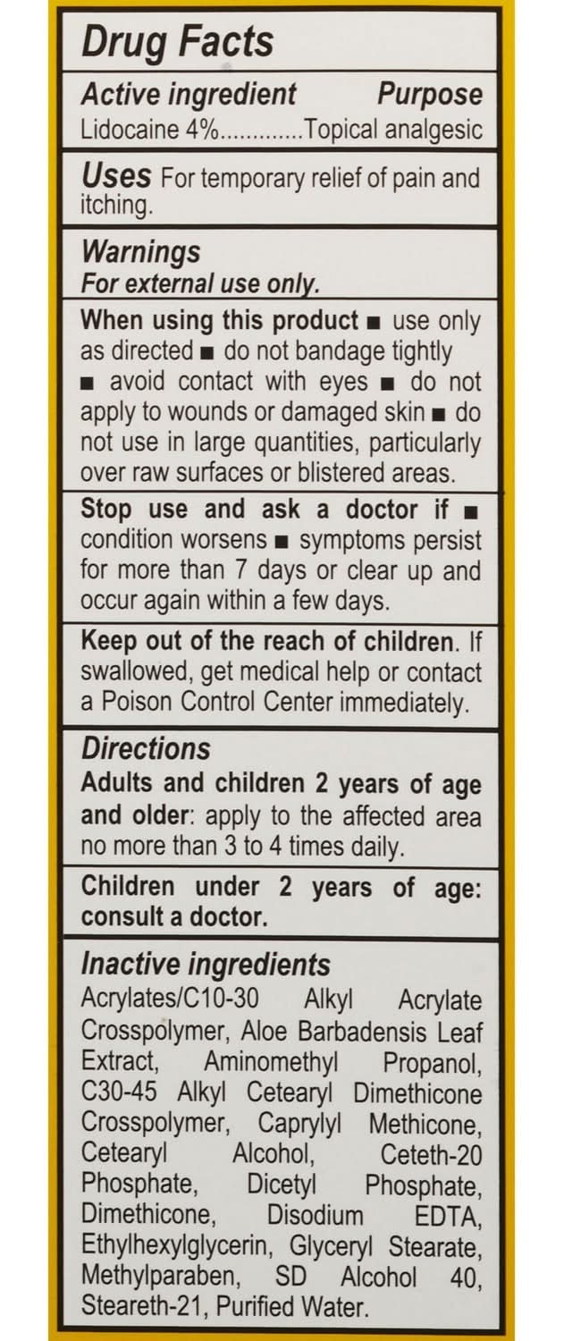 Ingredients: Active Ingredients: Lidocaine (4 %), Topical Analgesic. Inactive Ingredients: Acrylates/C10-30 Alkyl Acrylate Crossplolymer, Aloe Barbadensis Leaf Extract, Aminomethyl Propanol, C30-45 Alkyl Cetearyl Dimethicone Crosspolymer, Caprylyl Methicone, Cetearyl Alcohol, Ceteth-20 Phosphate, Dicetyl Phosphate, Dimethicone, Disodium EDTA, Ethylhexylglycerin, Glyceryl Stearate, Methylparaben, SD Alcohol 40, Steareth-21, Purified Water Additives: Glyceryl Stearate, Methylparaben