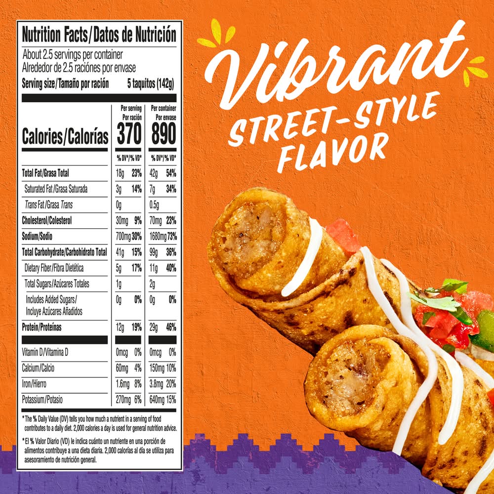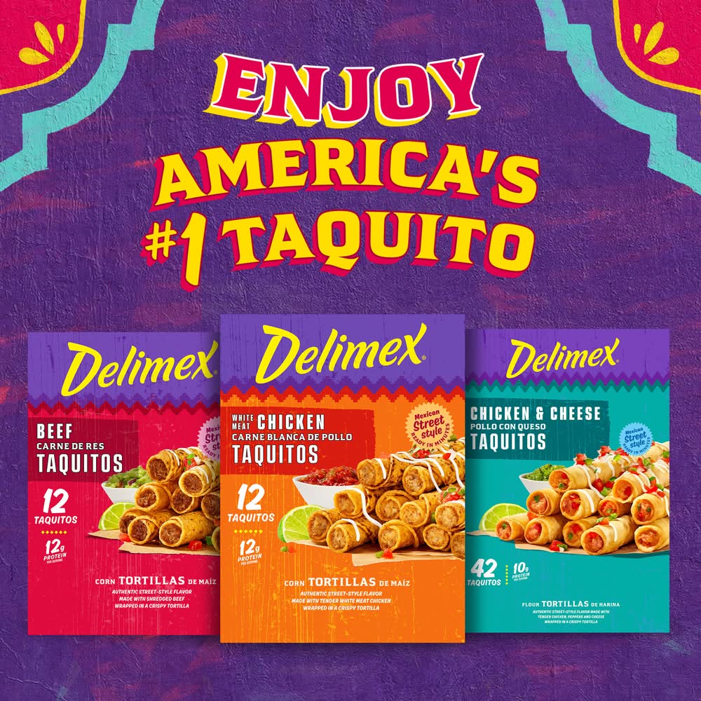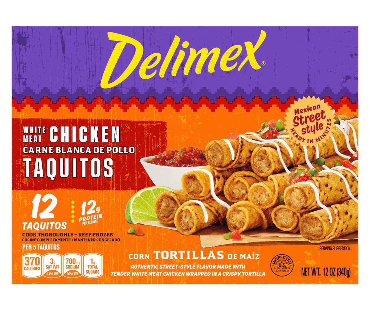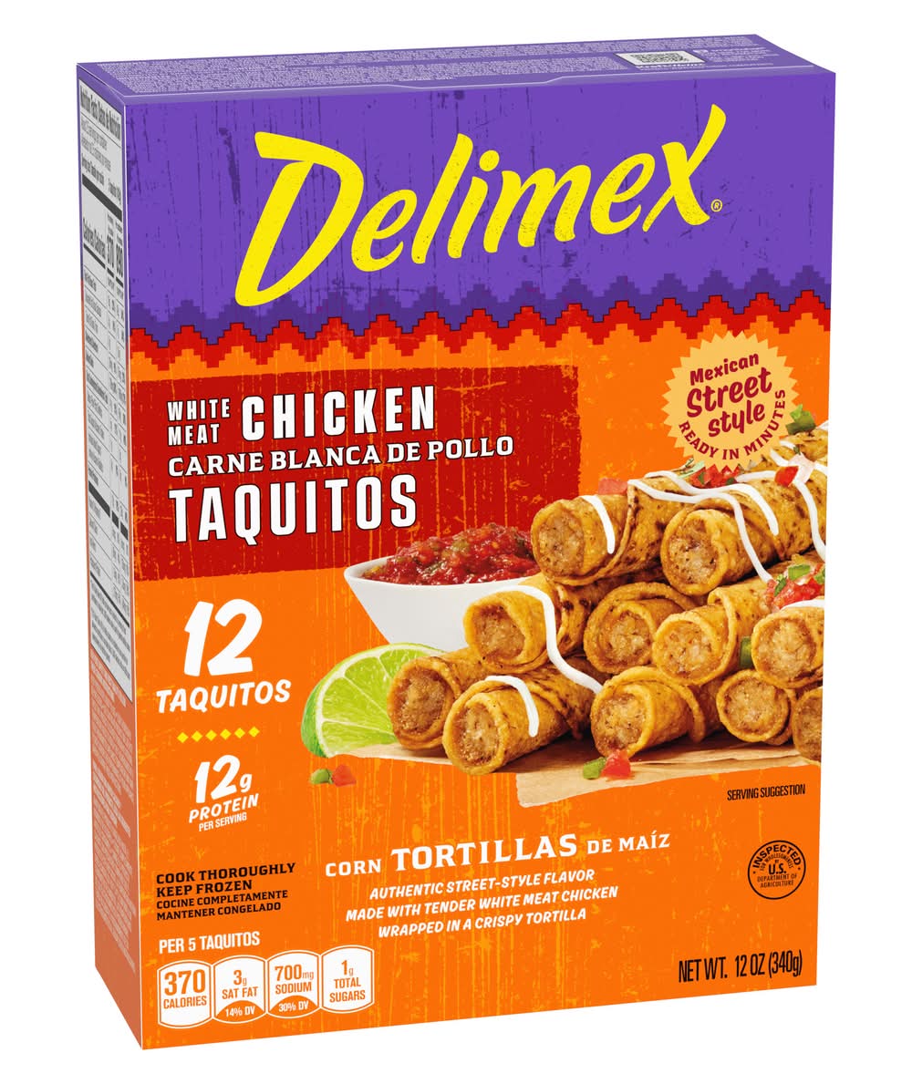 Taste the tradition of authentic, street-style Mexican flavors with Delimex White Meat Chicken Taquitos. Oscar Ancira Sr. founded Delimex in 1984, using Mexican-inspired ingredients and traditional recipes to recreate the savory taste of street-style taco shops. Our frozen taquitos are made with tender white meat chicken, seasoned with cumin and ancho chilies and wrapped in a crispy corn tortilla. Delimex taquitos can be prepared in the microwave, oven or air fryer, and are ready in minutes. Enjoy our taquitos as an appetizer, snack or part of your dinner, served with salsa, guacamole and sour cream. In each mouthwatering bite, you'll taste the original ingredients that you find in Mexican kitchens. Each 12-count box contains about 2.5 servings, with 12 grams of protein per serving. Store our 12-ounce box of frozen taquitos in the freezer until ready to prepare. Kraft Heinz Foods Company, Pittsburgh, PA, 15222