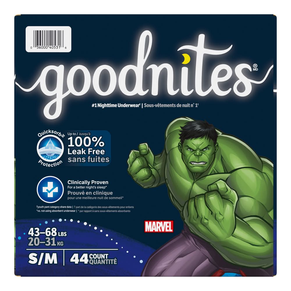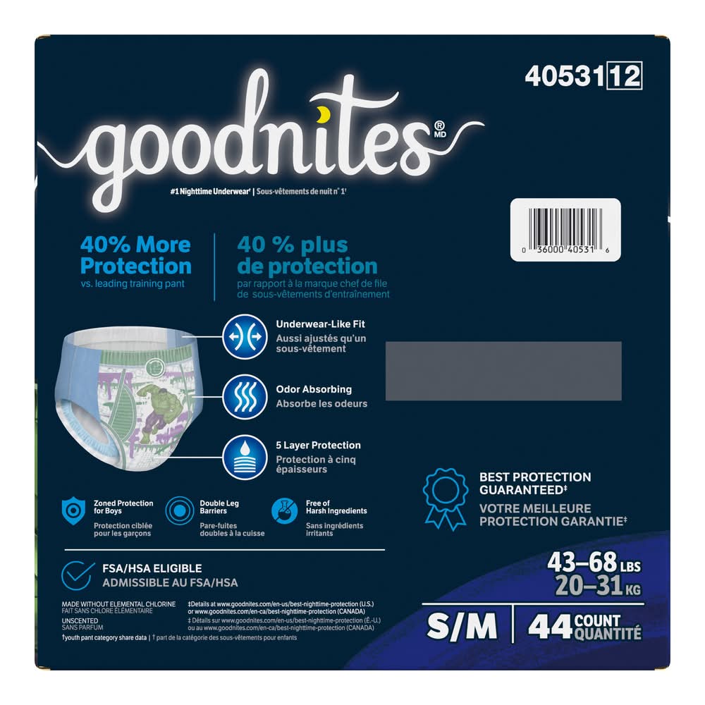 Help your kids wake up dry with Goodnites Nighttime Underwear, the #1 nighttime underwear.* These nighttime underwear are made with Quicksorb Protection for up to 100% leak-free nights no matter how your child sleeps. Designed specifically for bedwetting, Goodnites nighttime underwear are clinically proven for a better night’s sleep.** Goodnites Girls’ Nighttime Underwear is designed for a gap-free fit around the legs for comfortable overnight protection. Goodnites has zoned protection for girls, providing protection where girls need it the most. Not only that, but Goodnites holds 3 water bottles.*** Additionally, Goodnites overnight bedwetting underwear include odor absorbing material. Plus, these disposable, absorbent underwear are hypoallergenic and have no harsh ingredients. Goodnites bedwetting underwear provide an outstanding fit for kids 120-165 pounds. Goodnites are available in Size XS (28-43 lbs), Size S/M (43-68 lbs), Size L (68-95 lbs), Size XL (95-120 lbs) and Size XXL (120-165 lbs). Goodnites nighttime products are FSA/HSA-eligible in the US. (*Youth Pant category share data)(**vs. not wearing absorbent underwear) (***Three 8 oz. water bottles, 24 oz. total) Goodnites Boys' Nighttime Bedwetting Underwear: 44 overnight underwear for boys, size small/medium; fits children 43-68 lbs The #1 Nighttime Underwear* (*Youth Pant category share data) Help Your Kid Wake Up Dry: Goodnites bedwetting underwear for boys features Quicksorb Protection for up to 100% leak free nights no matter how your child sleeps Goodnites nighttime underwear are clinically proven for a better night’s sleep** (**vs. not using absorbent underwear) Goodnites Nighttime Underwear holds three water bottles*** (***Three 8 oz bottles of saline, 24 oz. saline total) Zoned Protection for Boys: Goodnites provides protection where boys need it the most Free of Harsh Ingredients: Goodnites bedwetting underwear are free of harsh ingredients and hypoallergenic Goodnites are available in Size XS (28-43 lbs), Size S/M (43-68 lbs), Size L (68-95 lbs), Size XL (95-120 lbs) and Size XXL (120-165 lbs) Goodnites nighttime underwear are FSA/HSA-eligible in the US • Size: S/M • Kimberly-clark Global Sales, LLC, Neenah,WI,54956 • Packaging: Reusable