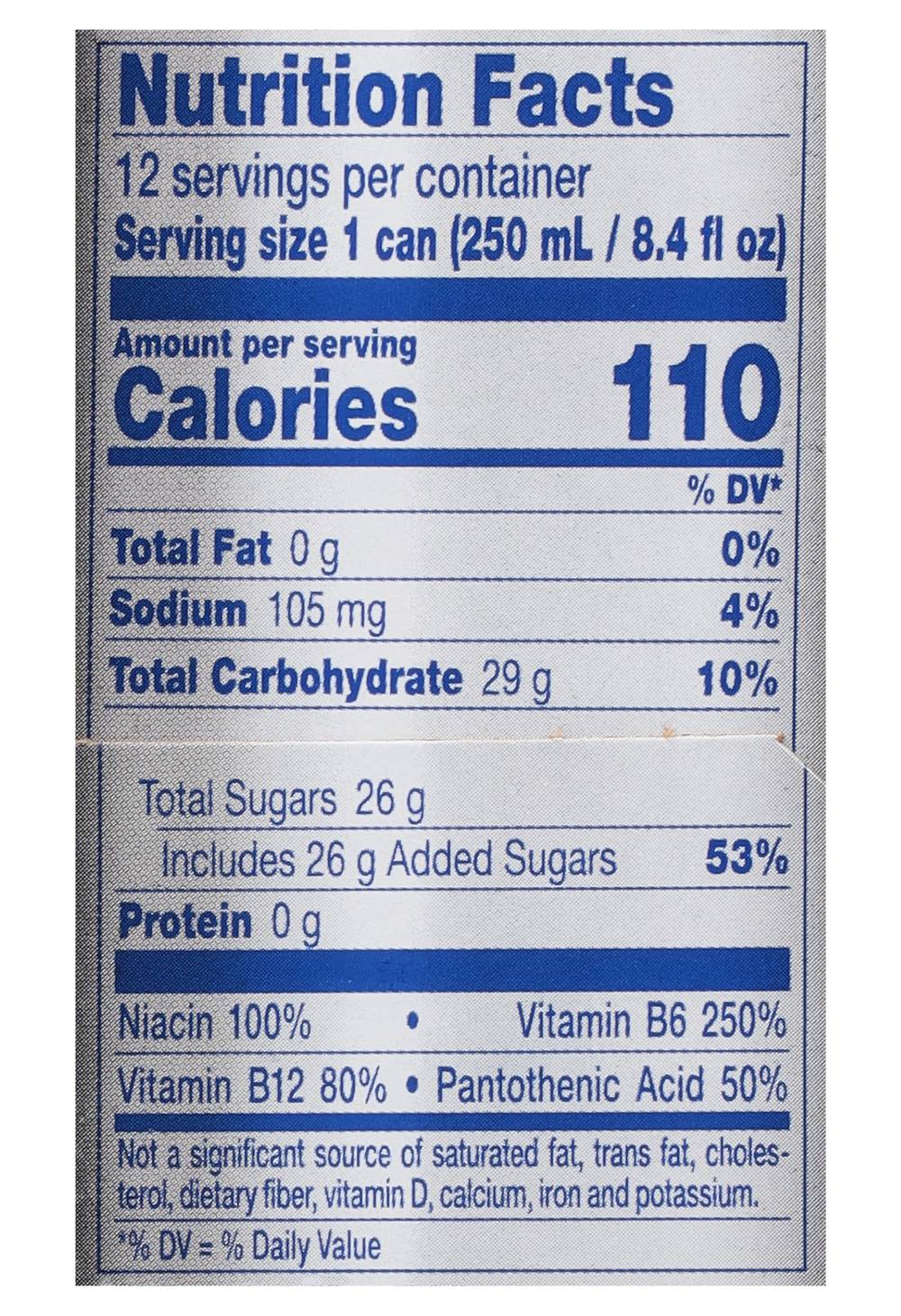 Ingredients: Carbonated Water, Sucrose, Glucose, Citric Acid, Taurine, Sodium Bicarbonate, Magnesium Carbonate, Caffeine, Niacinamide, Calcium Pantothenate, Pyridoxine HCl, Vitamin B12, Natural and Artificial Flavors, Colors.
