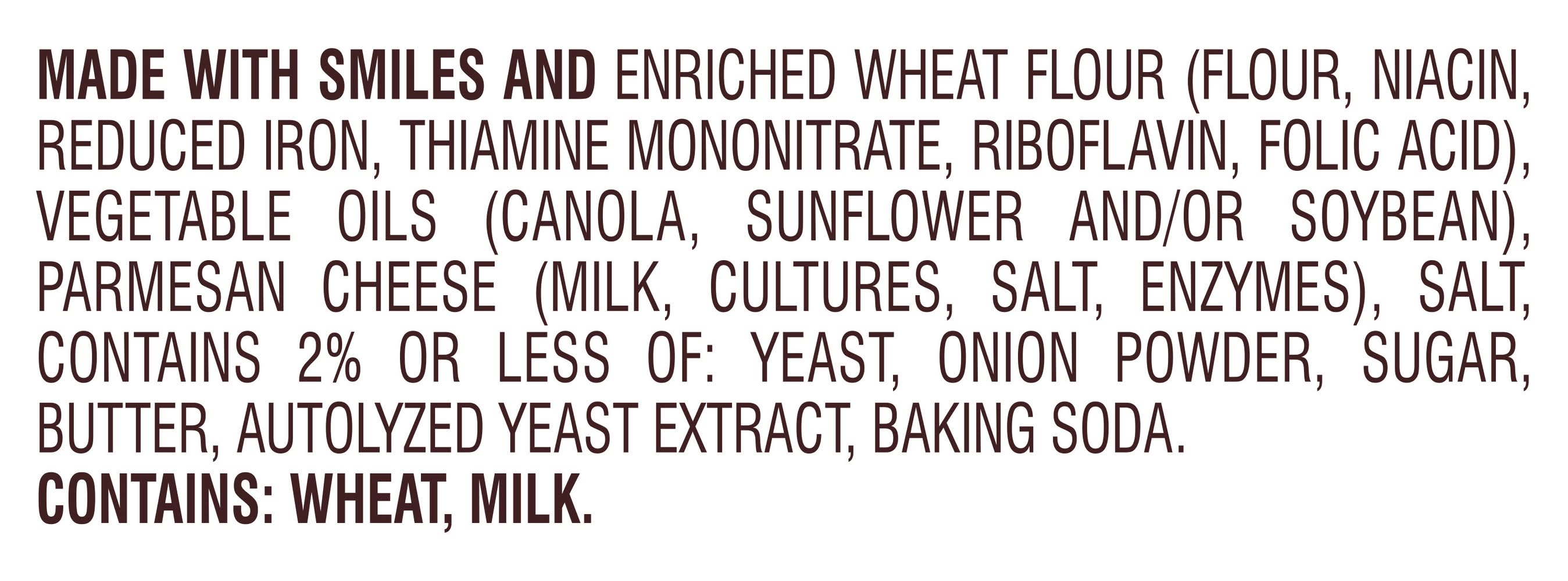 Ingredients: Made with Smiles and Enriched Wheat Flour (Flour Niacin Reduced Iron Thiamine Mononitrate Riboflavin Folic Acid) Vegetable Oils (Canola Sunflower and/or Soybean) Parmesan Cheese (Milk Cultures Salt Enzymes) Salt Contains 2% or Less of: Yeast Onion Powder Sugar Butter Autolyzed Yeast Extract Baking Soda. Contains: CONTAINS: Gluten, Milk/Dairy, Wheat
