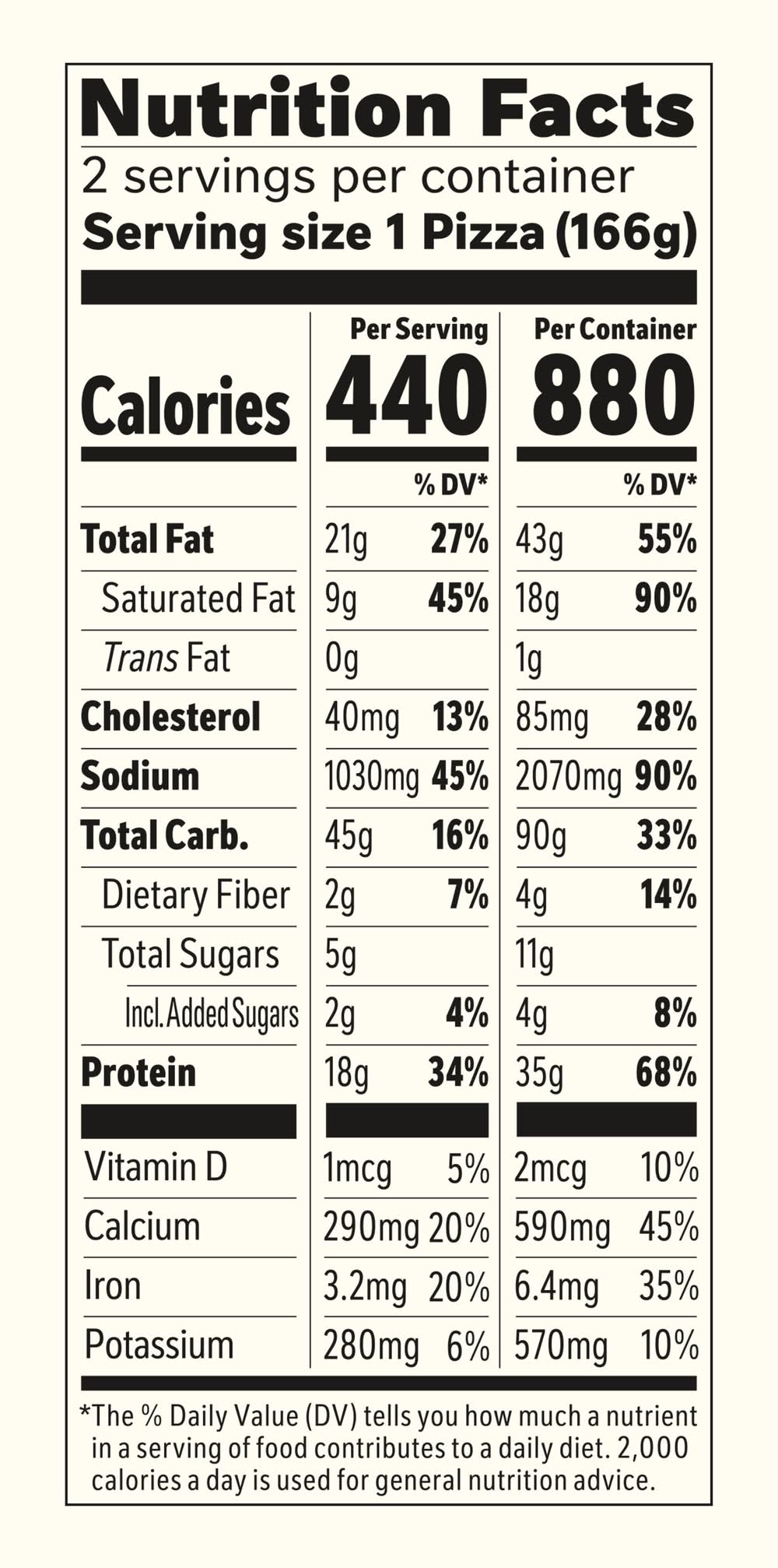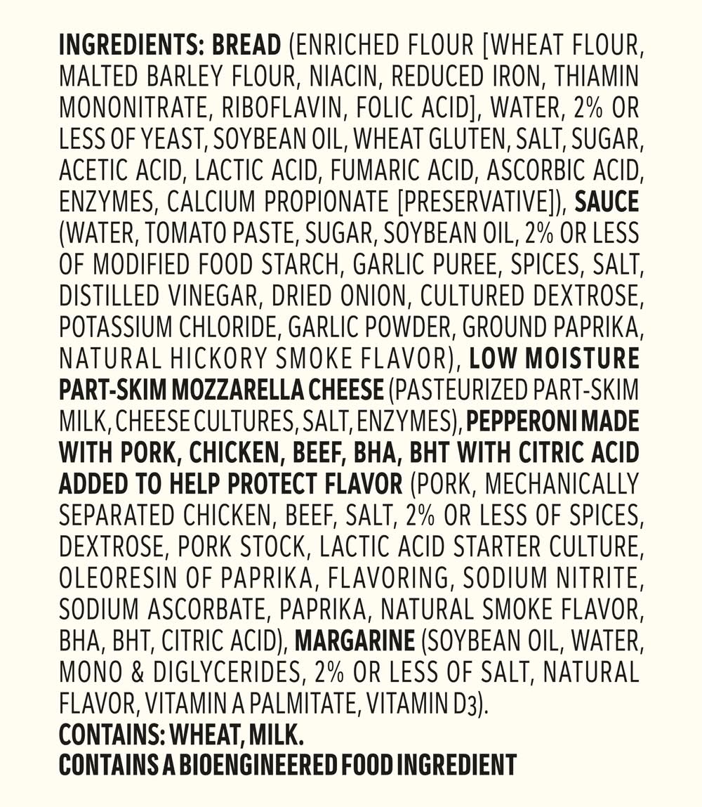 Ingredients: BREAD (ENRICHED FLOUR [WHEAT FLOUR, MALTED BARLEY FLOUR, NIACIN, REDUCED IRON, THIAMIN MONONITRATE, RIBOFLAVIN, FOLIC ACID], WATER, 2% OR LESS OF YEAST, SOYBEAN OIL, WHEAT GLUTEN, SALT, SUGAR, ACETIC ACID, LACTIC ACID, FUMARIC ACID, ASCORBIC ACID, ENZYMES, CALCIUM PROPIONATE [PRESERVATIVE]), SAUCE (WATER, TOMATO PASTE, SUGAR, SOYBEAN OIL, 2% OR LESS OF MODIFIED FOOD STARCH, GARLIC PUREE, SPICES, SALT, DISTILLED VINEGAR, DRIED ONION, CULTURED DEXTROSE, POTASSIUM CHLORIDE, GARLIC POWDER, GROUND PAPRIKA, NATURAL HICKORY SMOKE FLAVOR), LOW MOISTURE PART-SKIM MOZZARELLA CHEESE (PASTEURIZED PART-SKIM MILK, CHEESE CULTURES, SALT, ENZYMES), PEPPERONI MADE WITH PORK, CHICKEN, BEEF, BHA, BHT WITH CITRIC ACID ADDED TO HELP PROTECT FLAVOR (PORK, MECHANICALLY SEPARATED CHICKEN, BEEF, SALT, 2% OR LESS OF SPICES, DEXTROSE, PORK STOCK, LACTIC ACID STARTER CULTURE, OLEORESIN OF PAPRIKA, FLAVORING, SODIUM NITRITE, SODIUM ASCORBATE, PAPRIKA, NATURAL SMOKE FLAVOR, BHA, BHT, CITRIC ACID), MARGARINE (SOYBEAN OIL, WATER, MONO DIGLYCERIDES, 2% OR LESS OF SALT, NATURAL FLAVOR, VITAMIN A PALMITATE, VITAMIN D3), . Contains: CONTAINS: WHEAT, MILK.