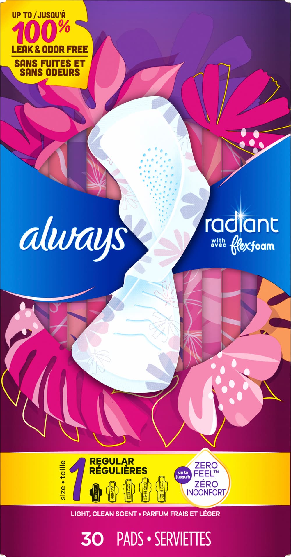Always Radiant Pads with Flex Foam and Flexi-Wings offer a combination of comfort and protection. Designed with a light, clean scent, these pads are capable of absorbing ten times their weight, providing reassurance for up to eight hours. The material is soft, created to conform to your movements, ensuring a barely-there feeling while maintaining security against leaks and odors. The pads come in a package of thirty, each with individual wrappers for convenience and discretion. Size: 1