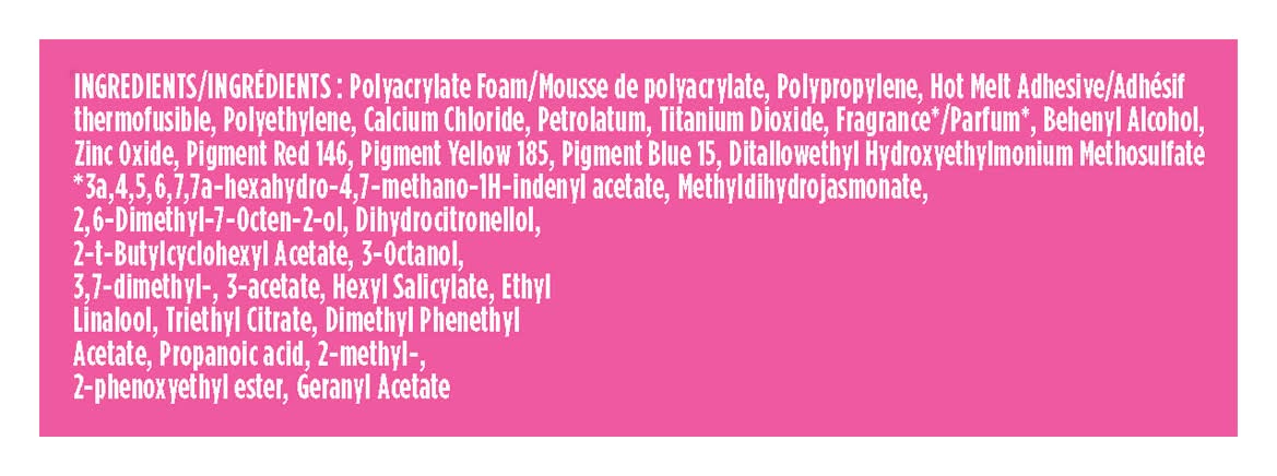 Ingredients: Polyacrylate Foam/Mousse De Polyacrylate, Polypropylene, Hot Melt Adhesive/Adhesif Thermofusible, Polyethylene, Calcium Chloride, Petrolatum, Titanium Dioxide, Fragrance*/Parfum*, Behenyl Alcohol, Zinc Oxide, Pigment Red 146, Pigment Yellow 185, Pigment Blue 15, Ditallowethyl Hydroxyethylmonium Methosulfate. * 3a, 4, 5, 6, 7, 7a-Hexahydro-4, 7-Methano-1h-Indenyl Acetate, Methyldihydrojasmonate, 2, 6-Dimethyl-7-Octen-2-Ol, Dihydrocitronellol, 2-T-Butylcyclohexyl Acetate, 3-Octanol, 3, 7-Dimethyl-, 3-Acetate, Hexyl Salicylate, Ethyl Linalool, Triethyl Citrate, Dimethyl Phenethyl Acetate, Propanoic Acid, 2-Methyl-, 2-Phenoxyethyl Ester, Geranyl Acetate