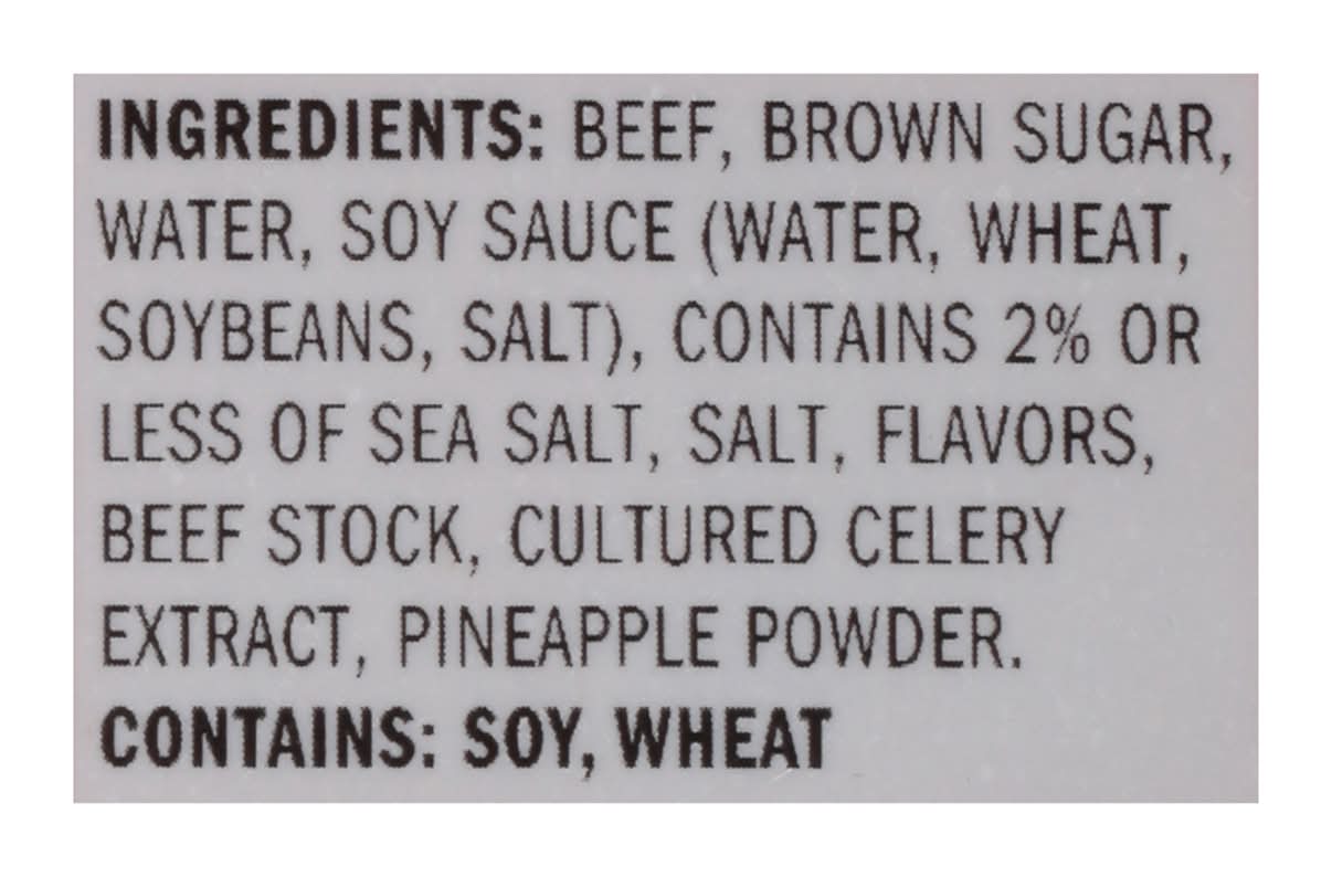 Ingredients: Beef, Water, Sugar, Brown Sugar, Soy Sauce (Wheat, Soybeans, Salt), Contains 2% or Less of Salt, Beef Stock, Flavors, Pineapple Powder Contains: Soybeans, Wheat