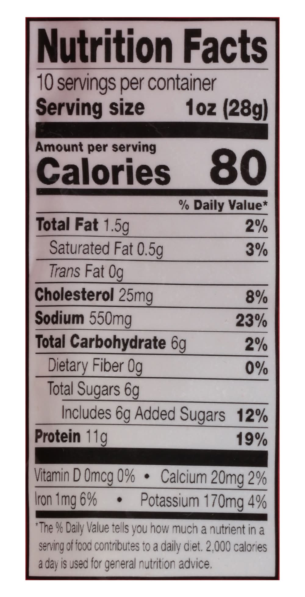 The Jack Links Teriyaki Beef Jerky, weighing 10 ounces, is a delicious snack made entirely from high-quality beef. It is carefully crafted without the addition of MSG, nitrates, nitrites, preservatives, or artificial ingredients, ensuring a natural and wholesome experience. With a fat content of only 4%, it is a healthy choice that is also low in carbohydrates. Made with 100% Beef No Added MSG No Nitrates & Nitrites No Added Preservatives No Artificial Ingredients 96% Fat Free Low Carb  • Flavor: Teriyaki • Number of servings: 10