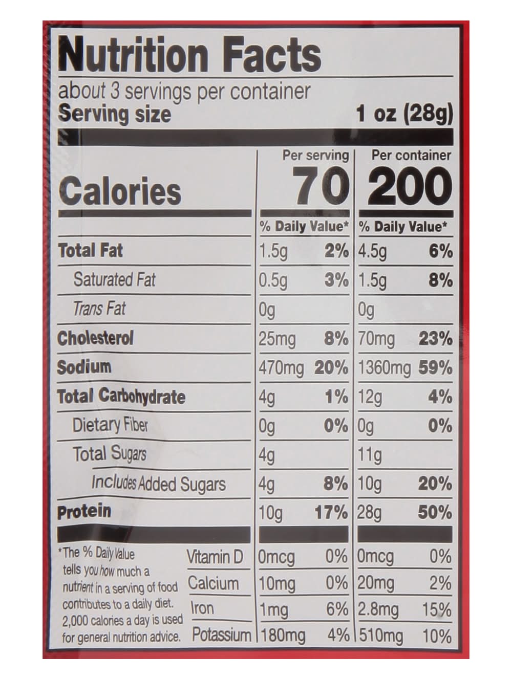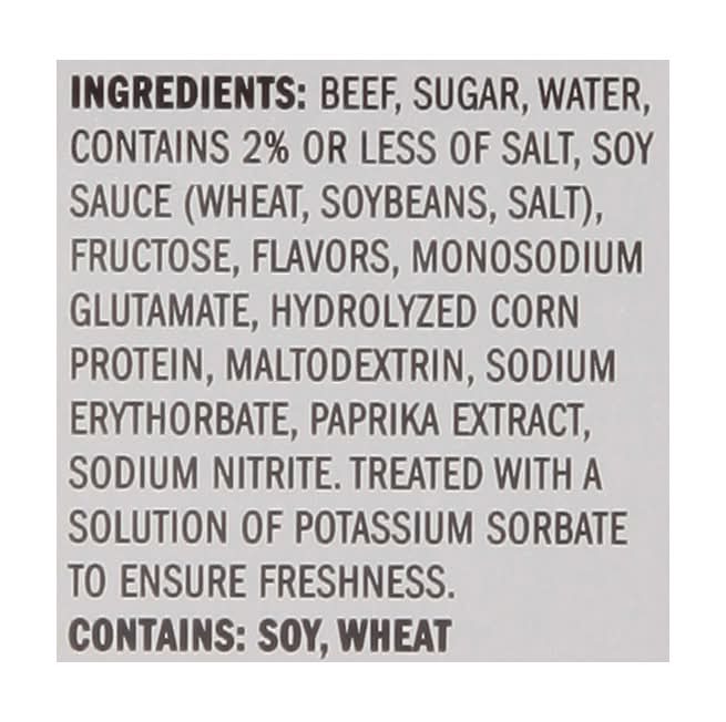 Ingredients: Beef, Sugar, Water, Contains 2% or Less of Salt, Soy Sauce (Wheat, Soybeans, Salt), Fructose, Flavors, Monosodium Glutamate, Hydrolyzed Corn Protein, Maltodextrin, Sodium Erythorbate, Paprika Extract, Sodium Nitrite. Treated with a Solution of Potassium Sorbate to Ensure Freshness Contains: Soybeans, Wheat, Corn