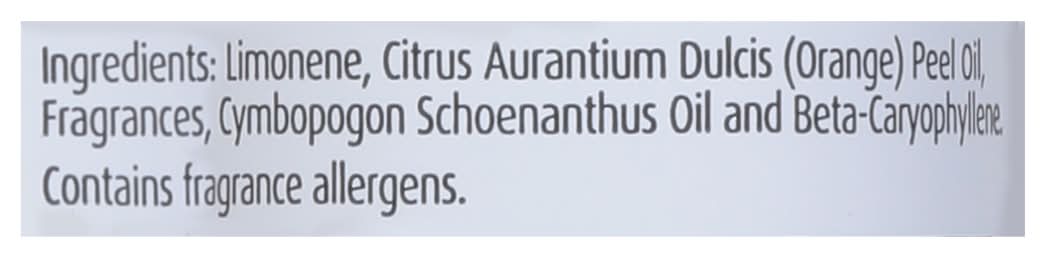 Ingredients: Limonene, Citrus Aurantium Dulcis (Orange) Peel Oil, Fragrances, Cymbopogon Schoenanthus Oil and Beta-Caryophyllene
